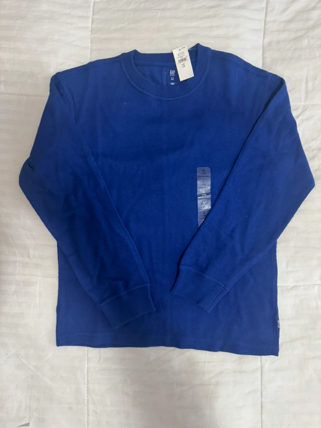 10Selling a brand new GAP kids long sleeve waffle knit shirt. It's a vibrant blue and size Large (10). Never worn, still has the tags!