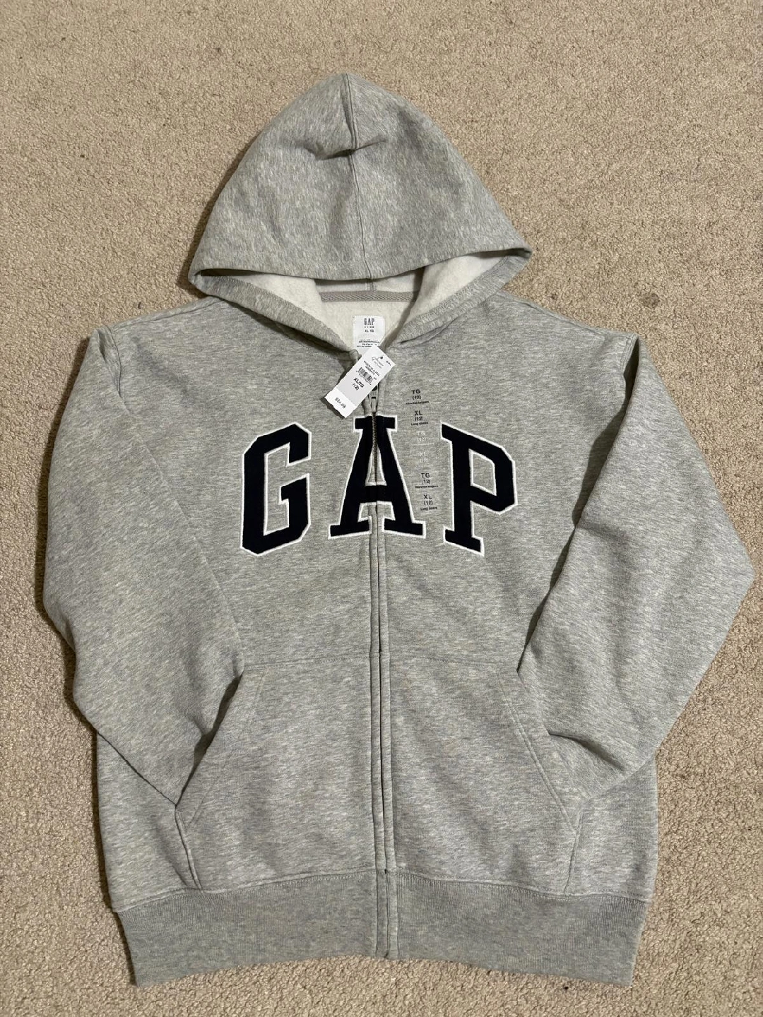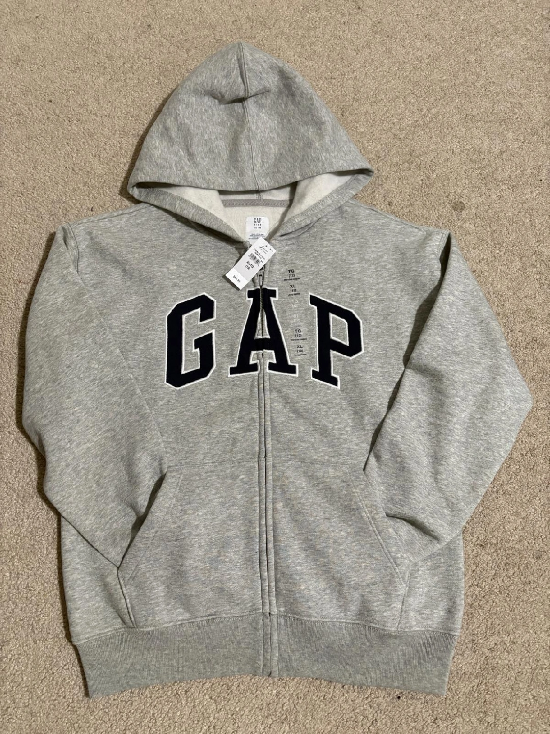 9Here's a brand new GAP Kids full zip hoodie! It's a size XL (12) and comes in a classic grey colour. The tag shows it originally retailed for $54.99