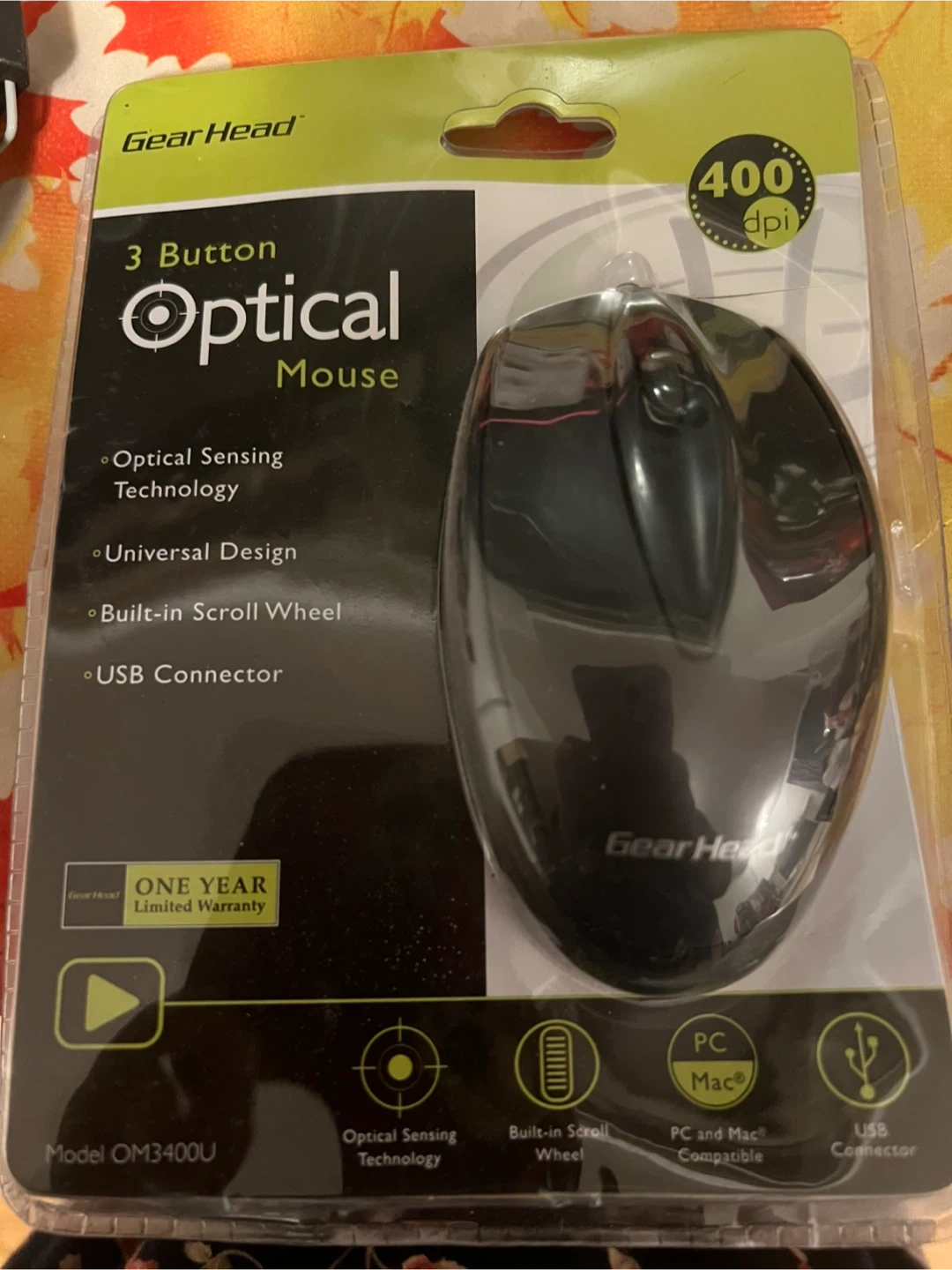 Selling a brand new Gear Head 3 Button Optical Mouse, model OM3400U! It features: - Optical Sensing Technology - Universal Design - Built-in Scroll Wheel - USB Connector It's compatible with both PC and Mac