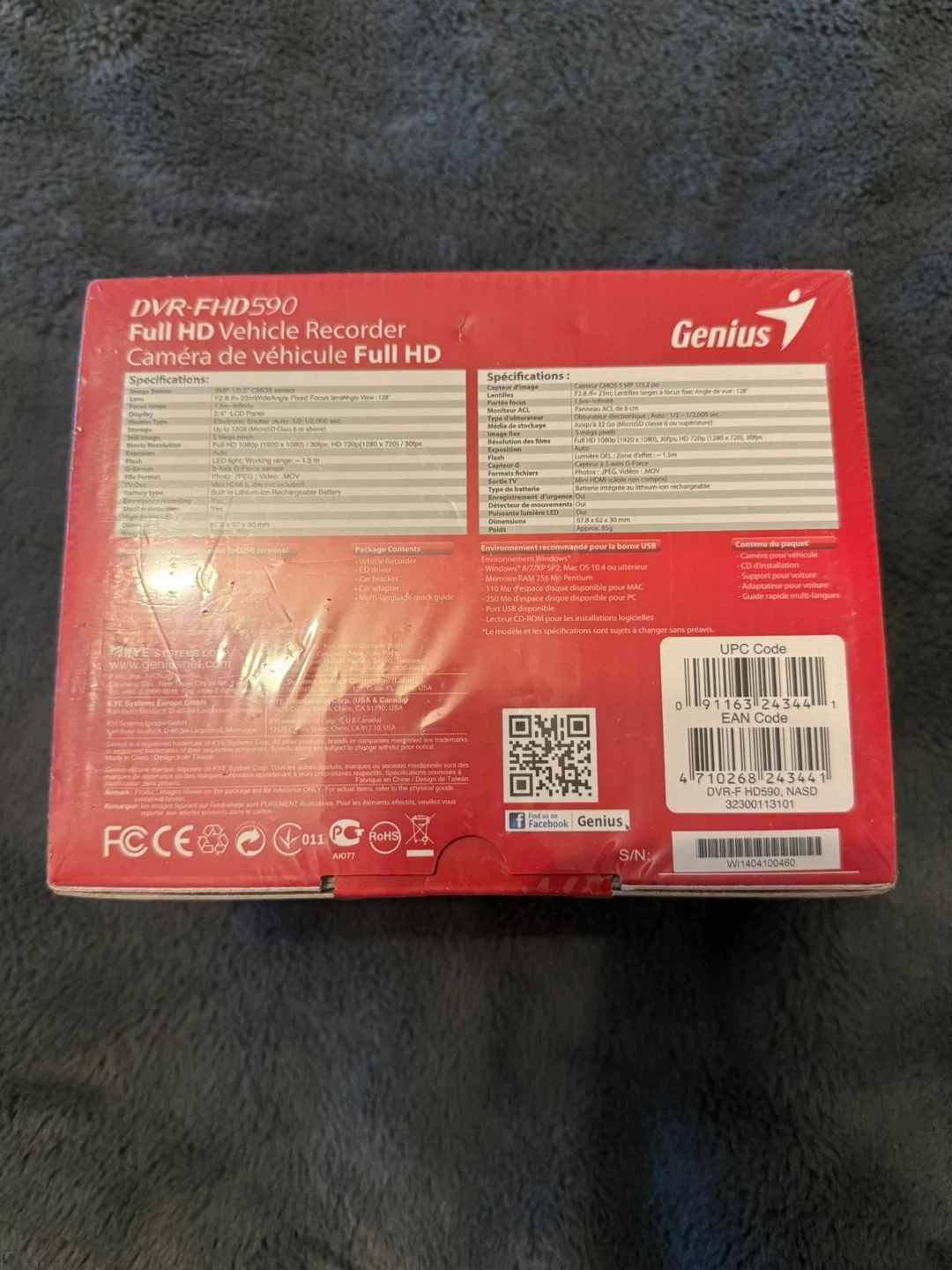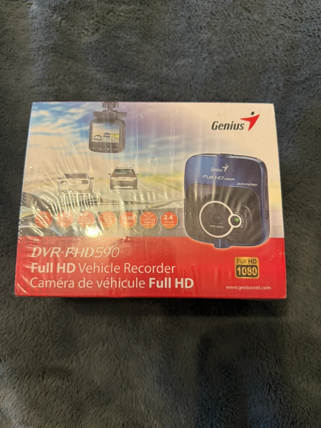Selling a brand new Genius DVR-FHD590 Full HD Vehicle Recorder! It's still in its original packaging. Here are some specs: - Full HD 1080P recording - 2.4" LCD screen - Wide angle lens - Includes car adapter and quick guide