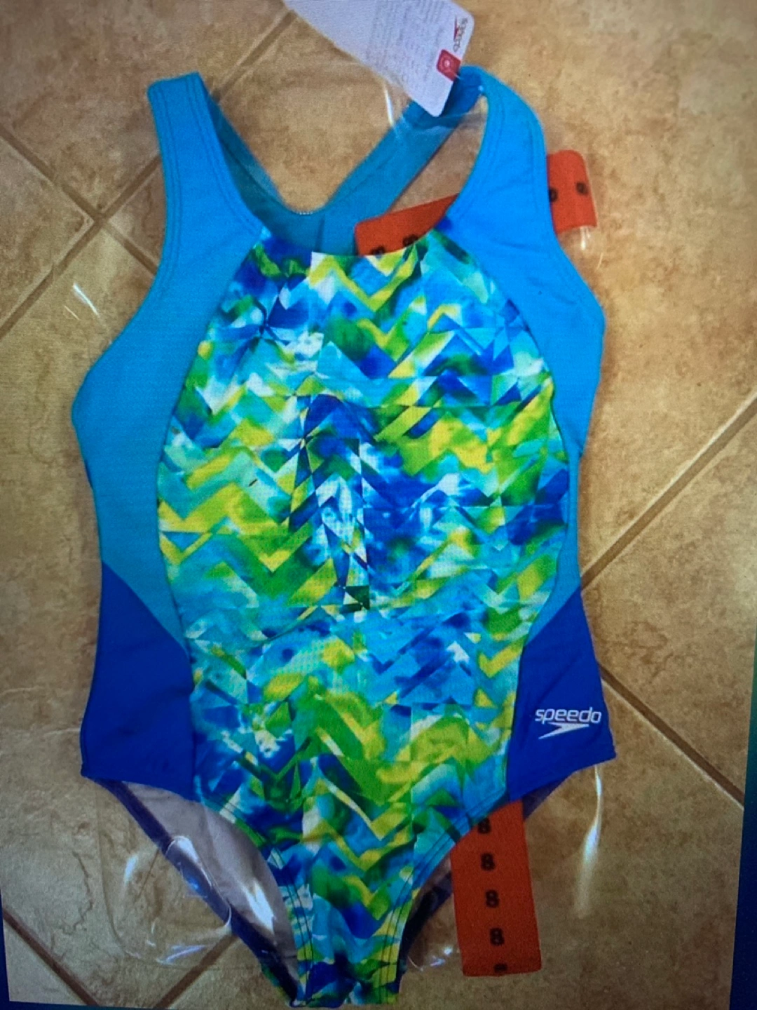 New with tags. Speedo girls' one-piece swimsuit. Size 8. Blue with green patterns