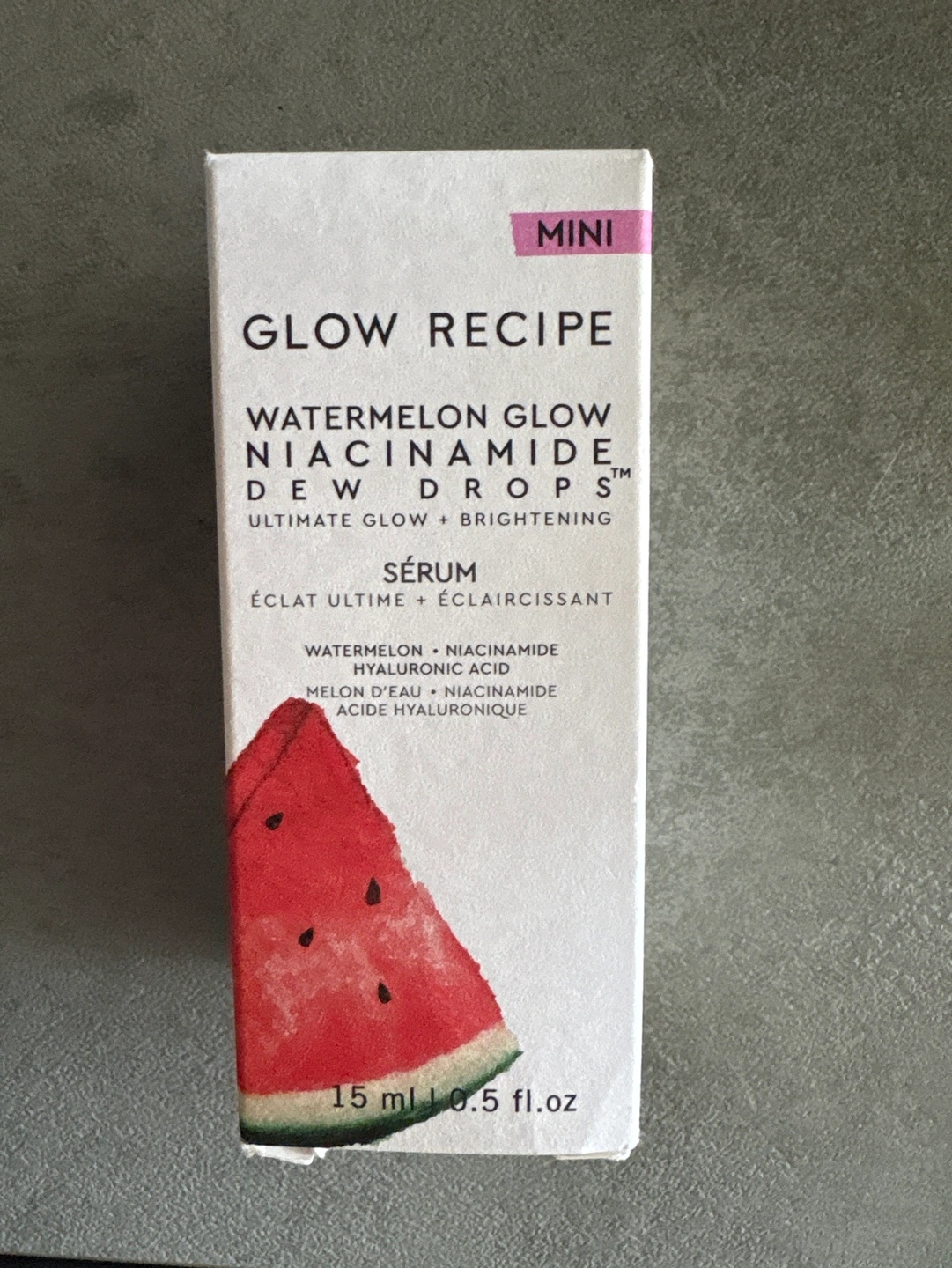 142Mini Watermelon Glow Niacinamide Dew Drops serum. Ultimate glow + brightening. Contains watermelon, niacinamide, and hyaluronic acid.