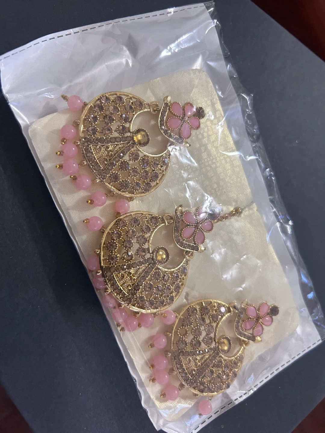 10Brand new earrings still in their packaging! These are gold coloured with pink accents and beaded details. They're very pretty and would make a great addition to any jewelry collection