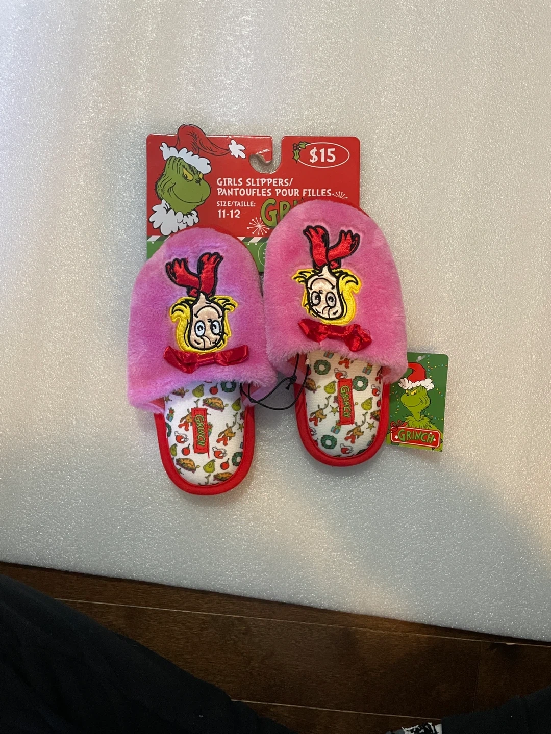 41These Grinch girls slippers are brand new with tags! They are a size 11-12 and feature a cute Grinch design. Perfect for keeping your little one's feet warm and cozy!
