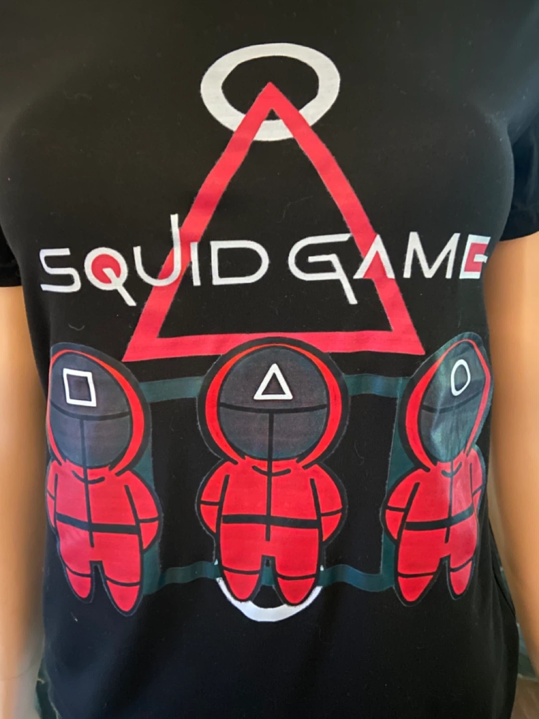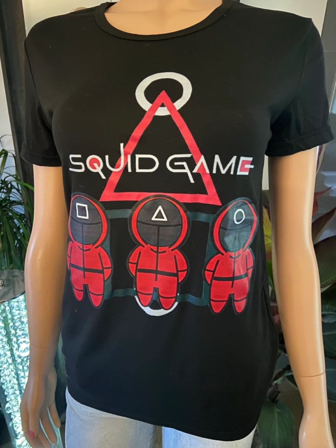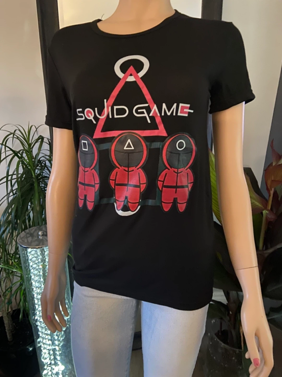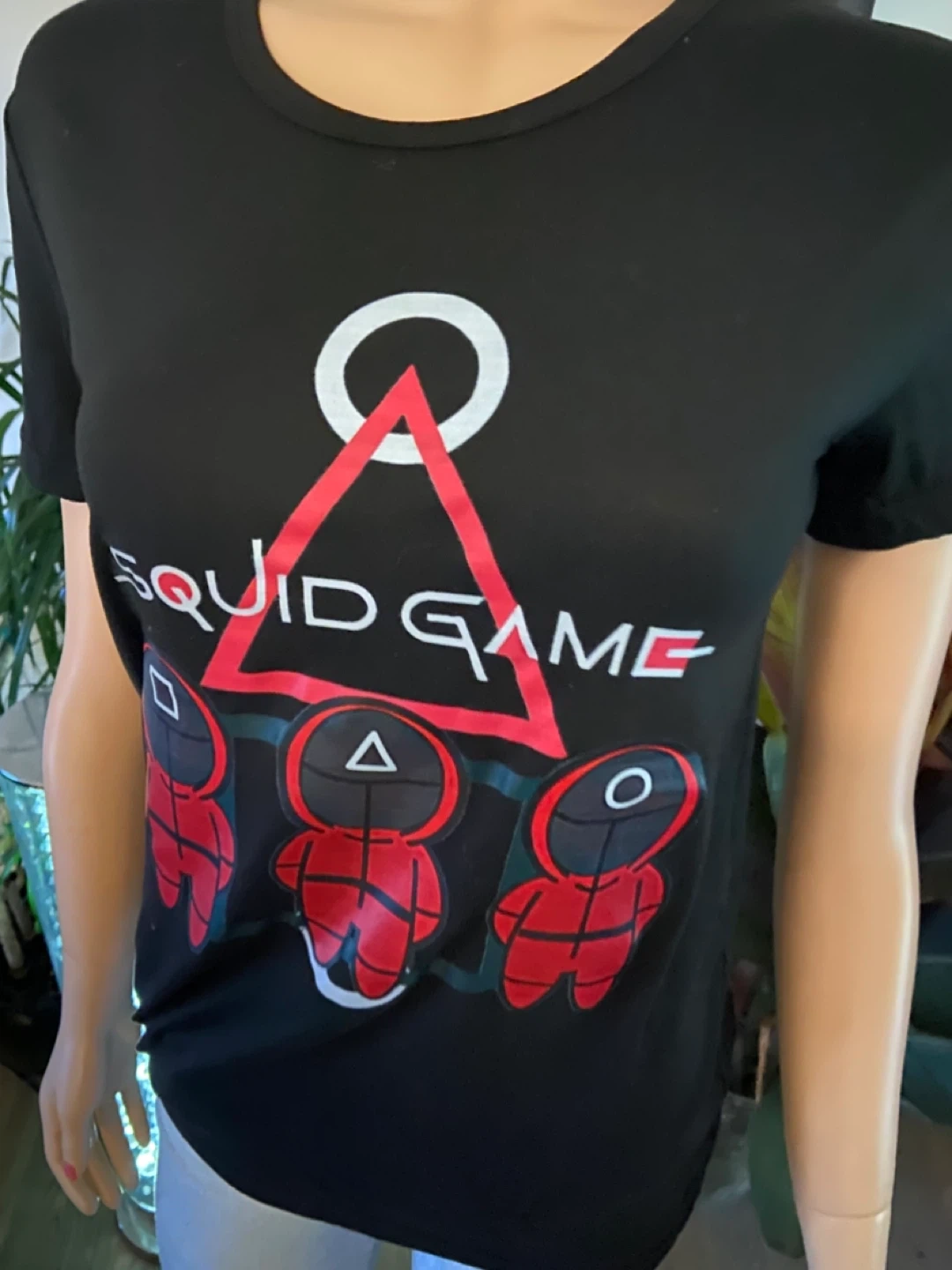 99Selling a black T-shirt with a Squid Game design. It features the iconic shapes and characters from the show. Great for any fan!