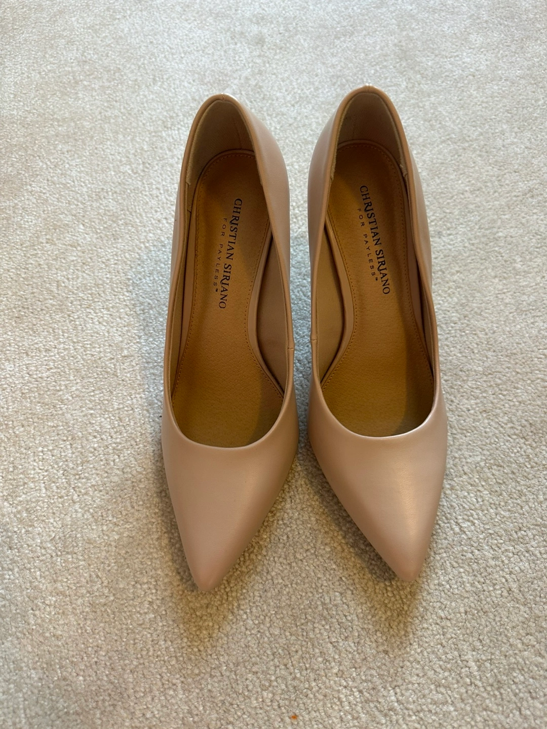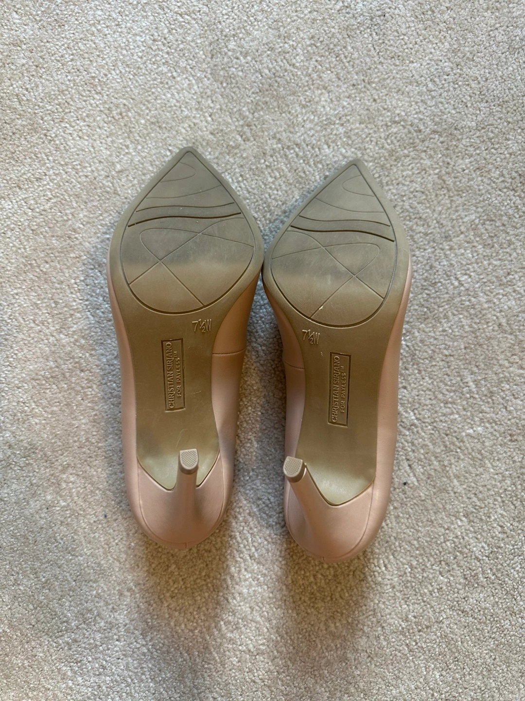 Used only one time, these heels are in excellent condition. No marks or scratches. Slightly more of a pink/neutral colour. They are a size 7.5W.