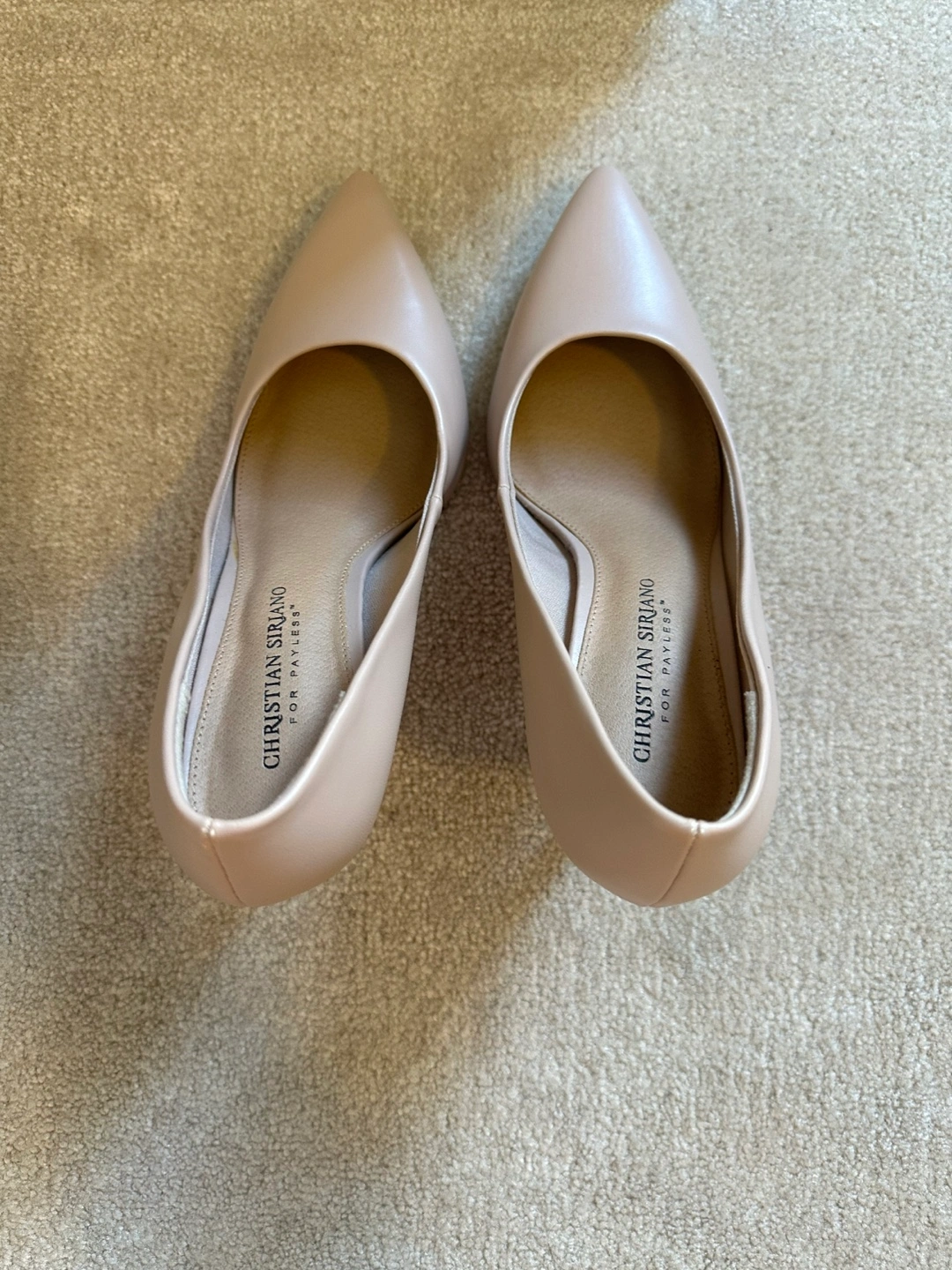 Used only one time, these heels are in excellent condition. No marks or scratches. Slightly more of a pink/neutral colour. They are a size 7.5W.