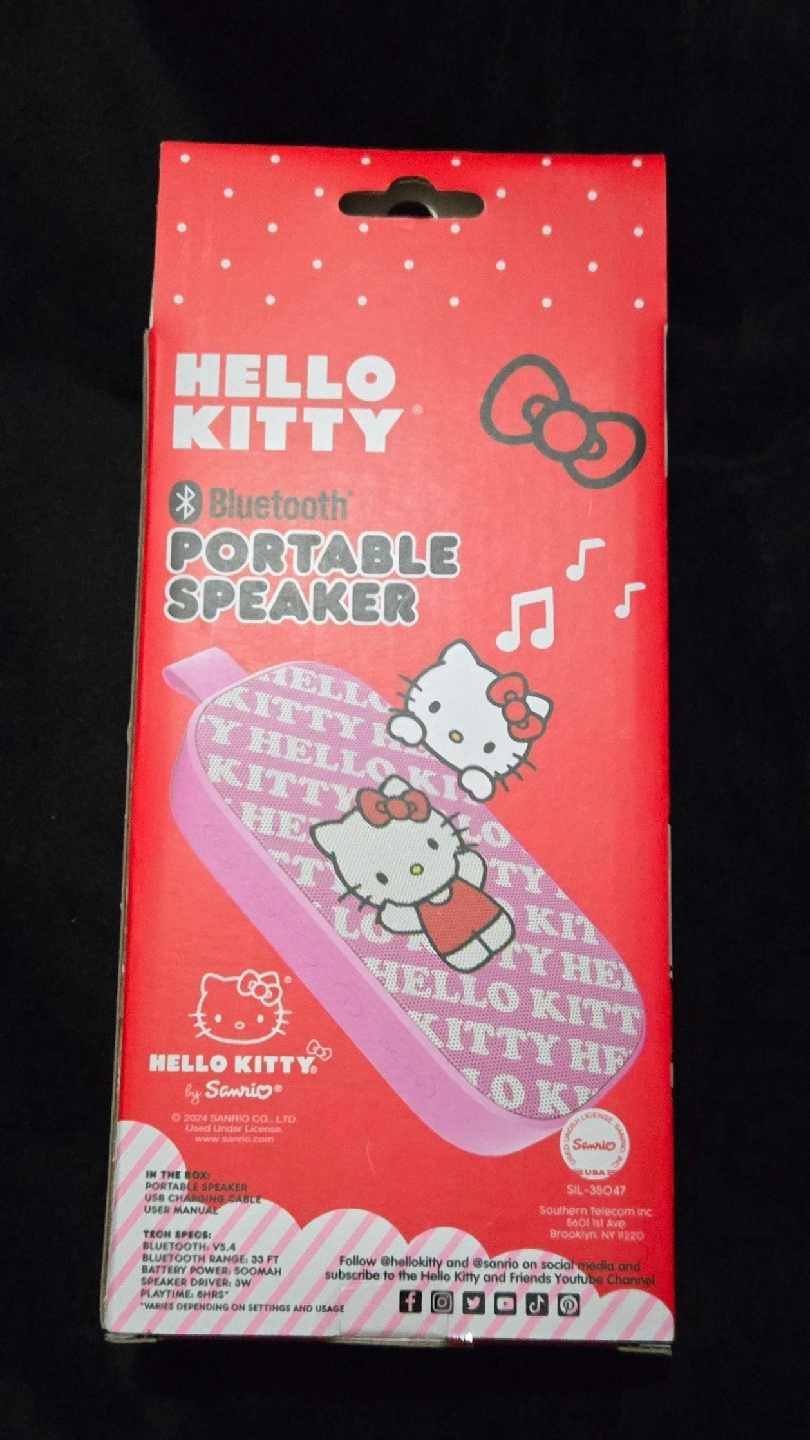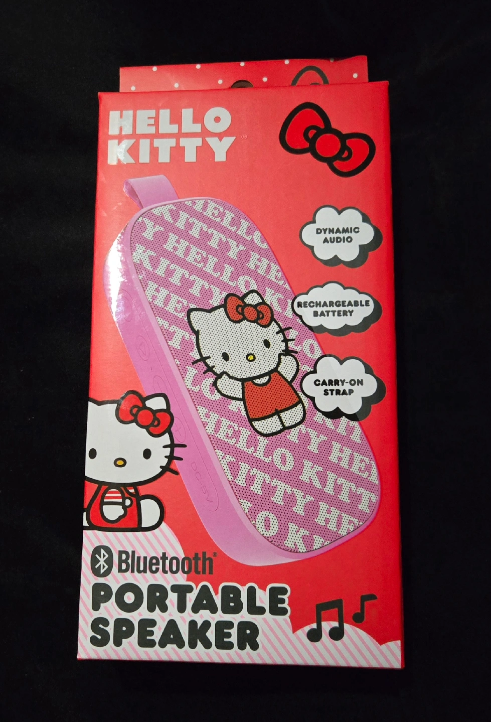Selling a brand new Hello Kitty Bluetooth portable speaker! It features dynamic audio and a rechargeable battery, plus a handy carry-on strap. The box includes the speaker, a USB charging cable, and the user manual. Such a cute speaker!