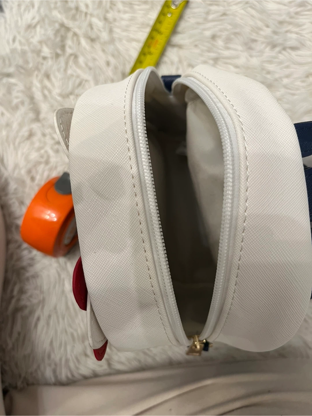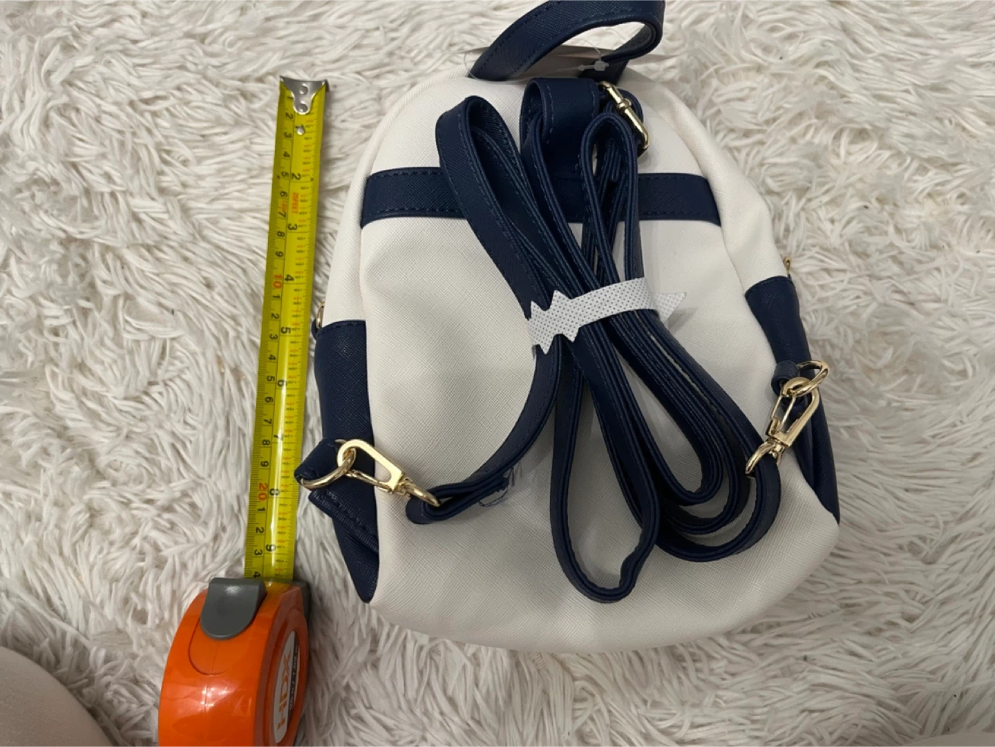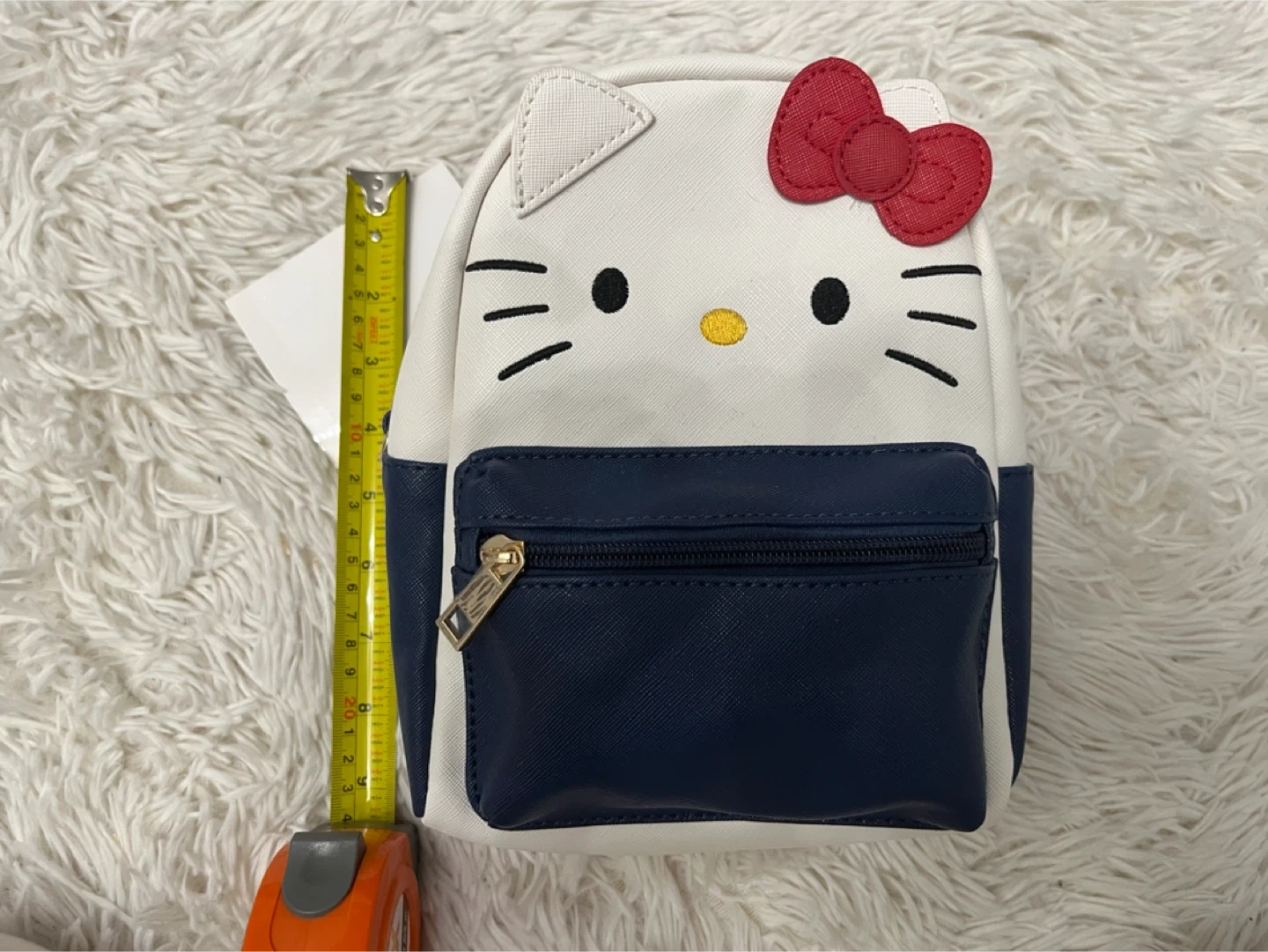 This is a super cute Hello Kitty mini backpack! It's white with navy blue accents and a red bow. Perfect for carrying small items, and the size is approximately 9 x 7 x 3. It has a zippered front pocket and adjustable straps. It was bought in Japan.