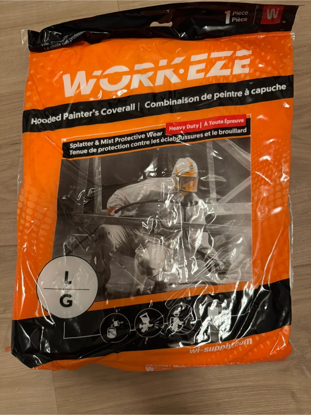 38Heavy duty and provides splatter and mist protection. Perfect for painting or food processing jobs. It features elastic wrists and ankles, a hood with a snug fit, and microporous construction for breathability. It's also latex-free. Size large, men’s I have 4 to sell. Take all 4 for $15