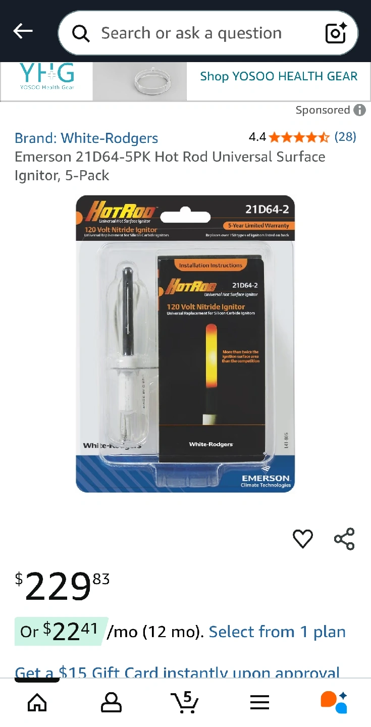 38Selling a brand new Hot Rod 21D64-2 Universal Hot Surface Ignitor. It's a 120 Volt Nitride Ignitor and a universal replacement for Silicon Carbide Ignitors. The packaging includes installation instructions. Retails for $327.50!