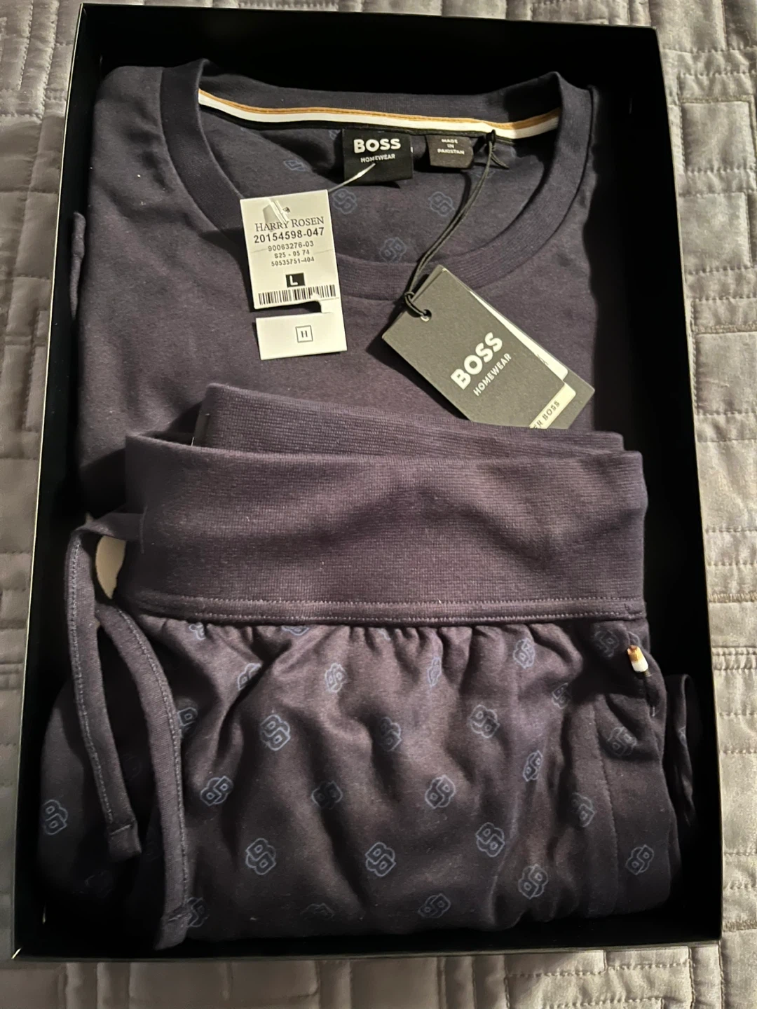 60I'm selling a brand new Hugo Boss Homewear set in size L. It comes with a long-sleeve shirt and pants, and the original box is included! Great for a gift - never to early to holiday shop !