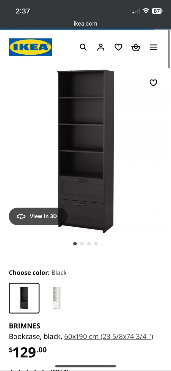 Selling an IKEA Brimnes bookcase in black! It's 60x190 cm (23 5/8x74 3/4 "). Originally bought for $129 plus tax. Comes in the original box! Never opened before, brand new.