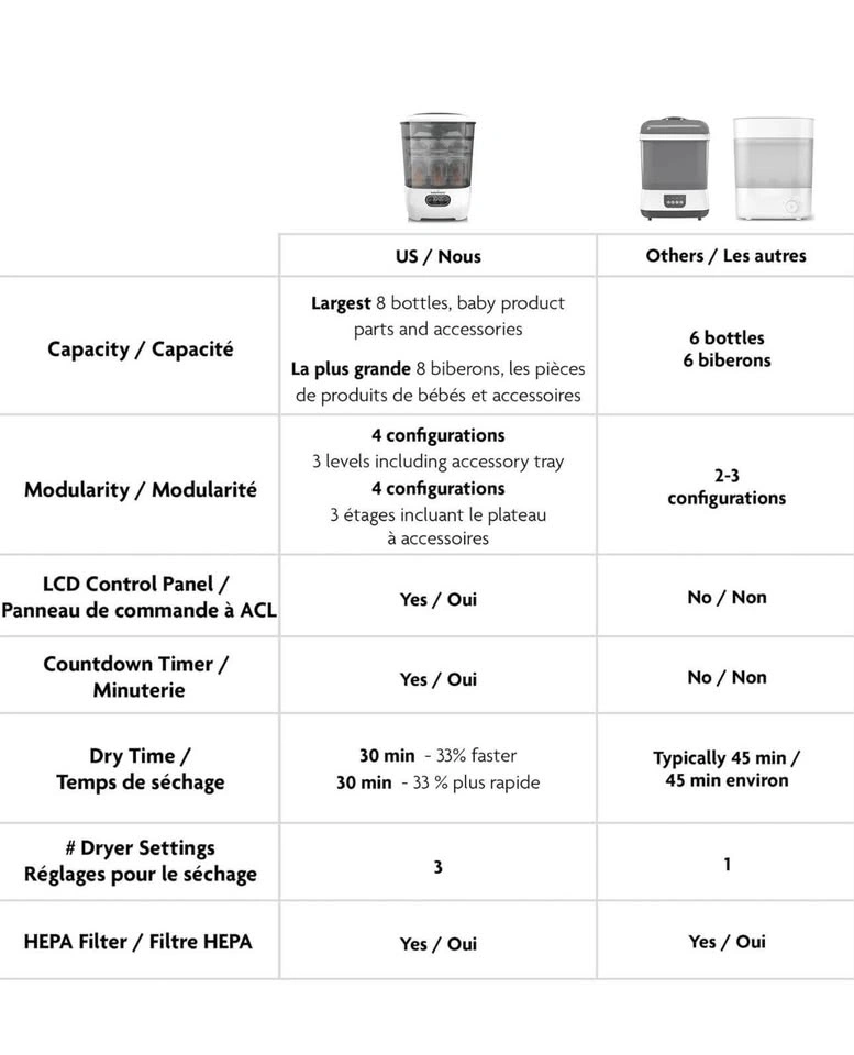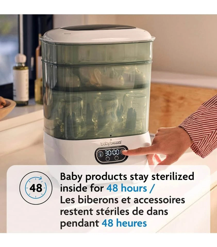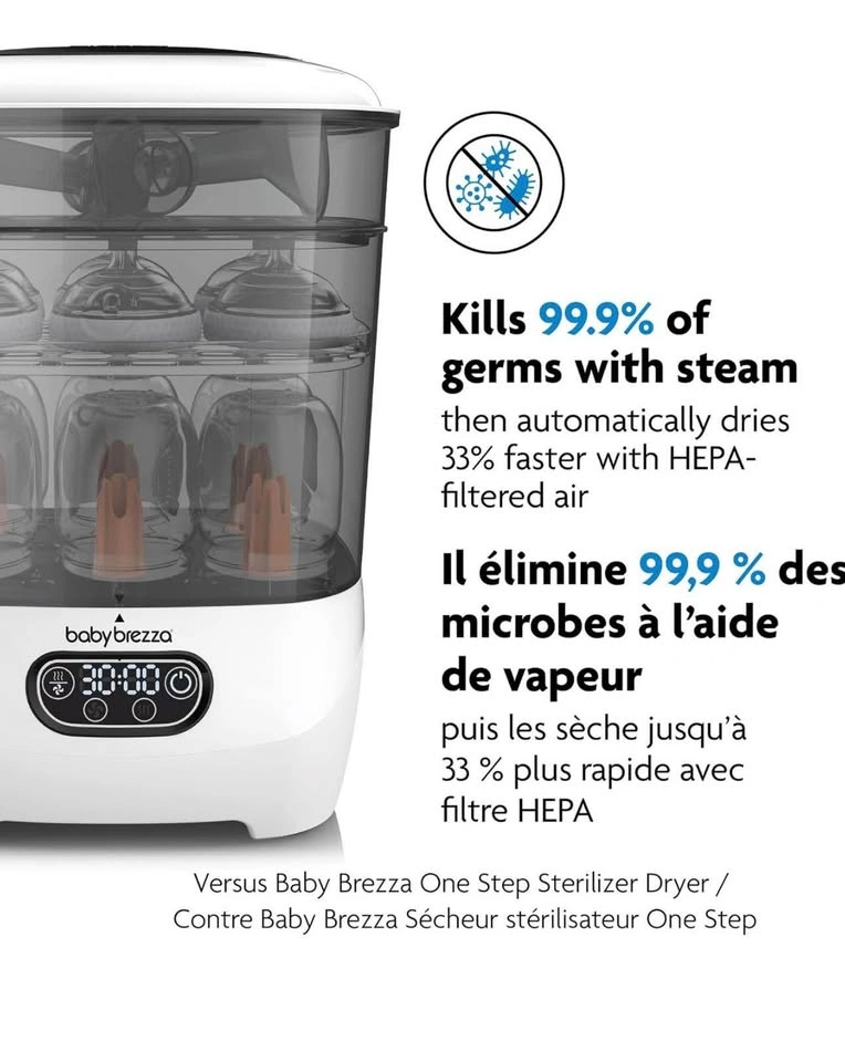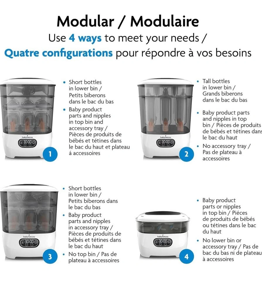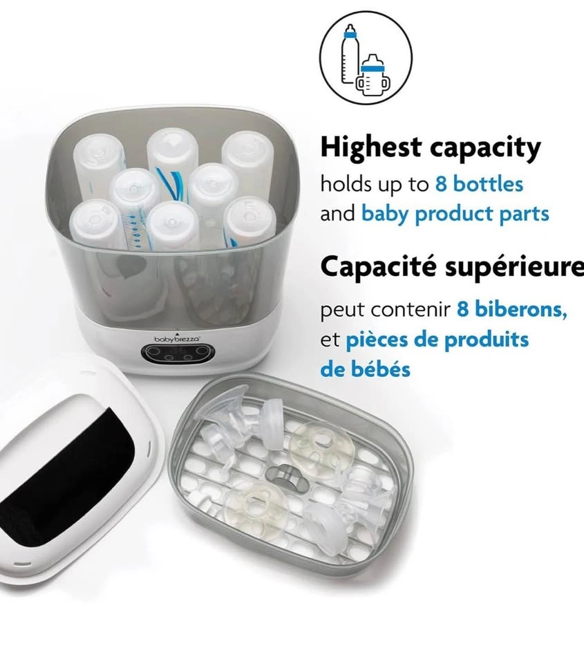 Automatically sterilizes & dries 33% faster bottles, baby product parts, pacifiers, teethers, sippy cups and other accessories from any brand in 1 easy step, saving you time. Kills 99.9% of germs: Uses natural steam to eliminate 99.9% of harmful bacteria, mold & the yeast that causes thrush, then dries automatically with HEPA-filtered, germ-free hot air; Products remain sterilized inside for 48 hours when left inside. Largest capacity: Holds 8 bottles, baby product parts and accessories from any brand including glass bottles. Compatible with plastic, silicone and glass products. Easy to use, 4 in 1 functionality with Digital Countdown Timer: Use LCD control panel to choose from 4 functions (Sterilizer & Dryer, Sterilizer Only, Dryer Only or Storage System); Digital countdown timer lets you see how much time is left in the cycle. Other Features: Most modular design - Use 4 different ways to meet your needs. Includes large lower bin, shorter upper bin and unique accessory tray; Stainless steel heating plate won’t rust; Includes replaceable HEPA filter; 1-year limited warranty. Pick up - Courtice Please check my other lots of listings