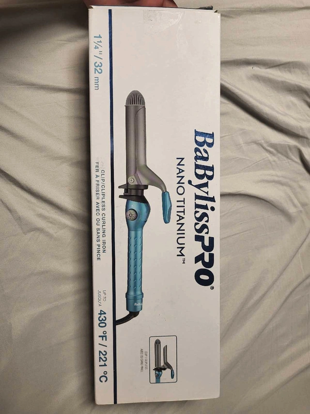 Get ready to create stunning curls with this BaBylissPRO Nano Titanium 1 1/4" Clipless Curling Iron! This curling iron heats up to 430°F (221°C), perfect for achieving long-lasting styles. The nano titanium barrel ensures even heat distribution for smooth, shiny curls. This item is in excellent used condition, ready to help you achieve salon-quality results at home. Specifications: * Barrel Size: 1 1/4 inch (32mm) * Technology: Nano Titanium * Maximum Temperature: 430°F (221°C) * Type: Clipless Curling Iron. If the ad is up, it's available!