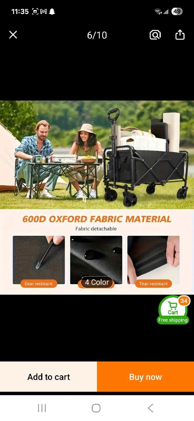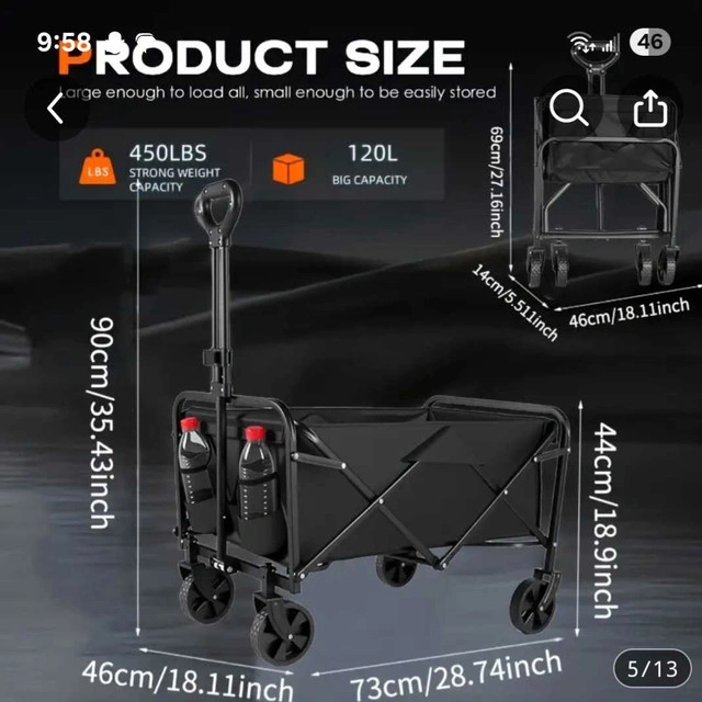 Get ready to simplify your life with this folding wagon, designed with durable 600D Oxford fabric and a robust frame capable of carrying up to 338 lbs! Perfect for gardening, camping, shopping, or a day at the park, this versatile cart makes transporting your gear a breeze. Note that this wagon has been used but remains in good working condition. * Heavy-duty steel frame * Durable 600D Oxford fabric * Folds for easy storage * 338 lbs weight capacity * Telescoping handle I'm asking $40 for this handy helper. Please note: If the ad is up, the wagon is available. Let's make your hauling tasks a thing of the past!