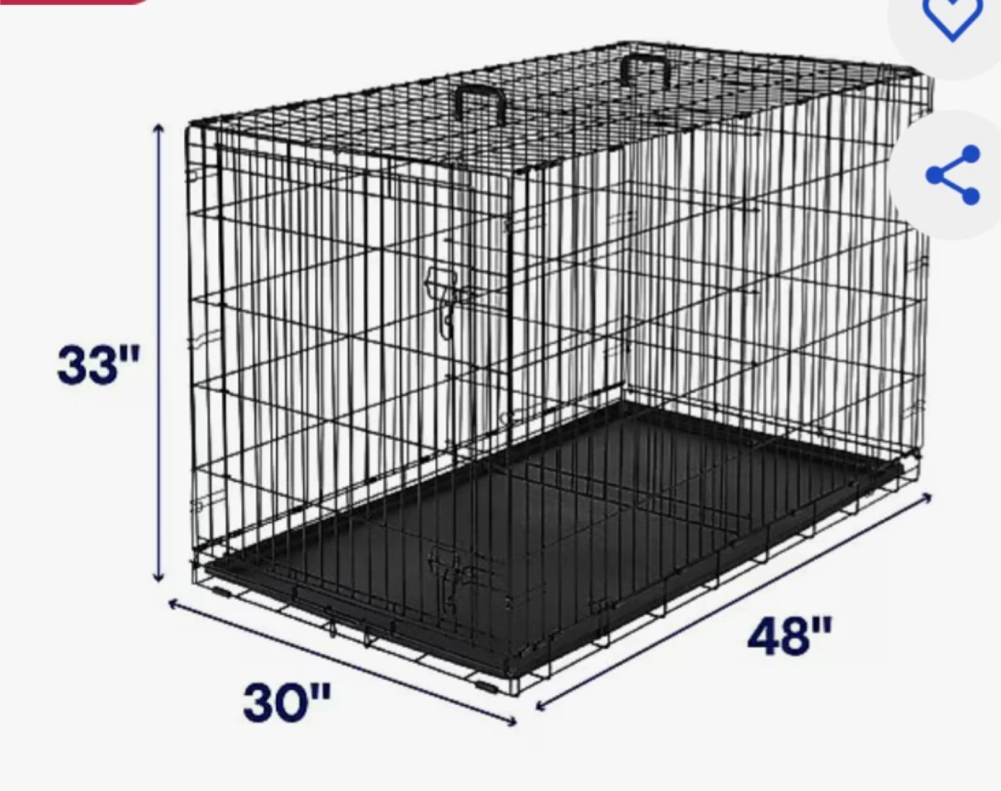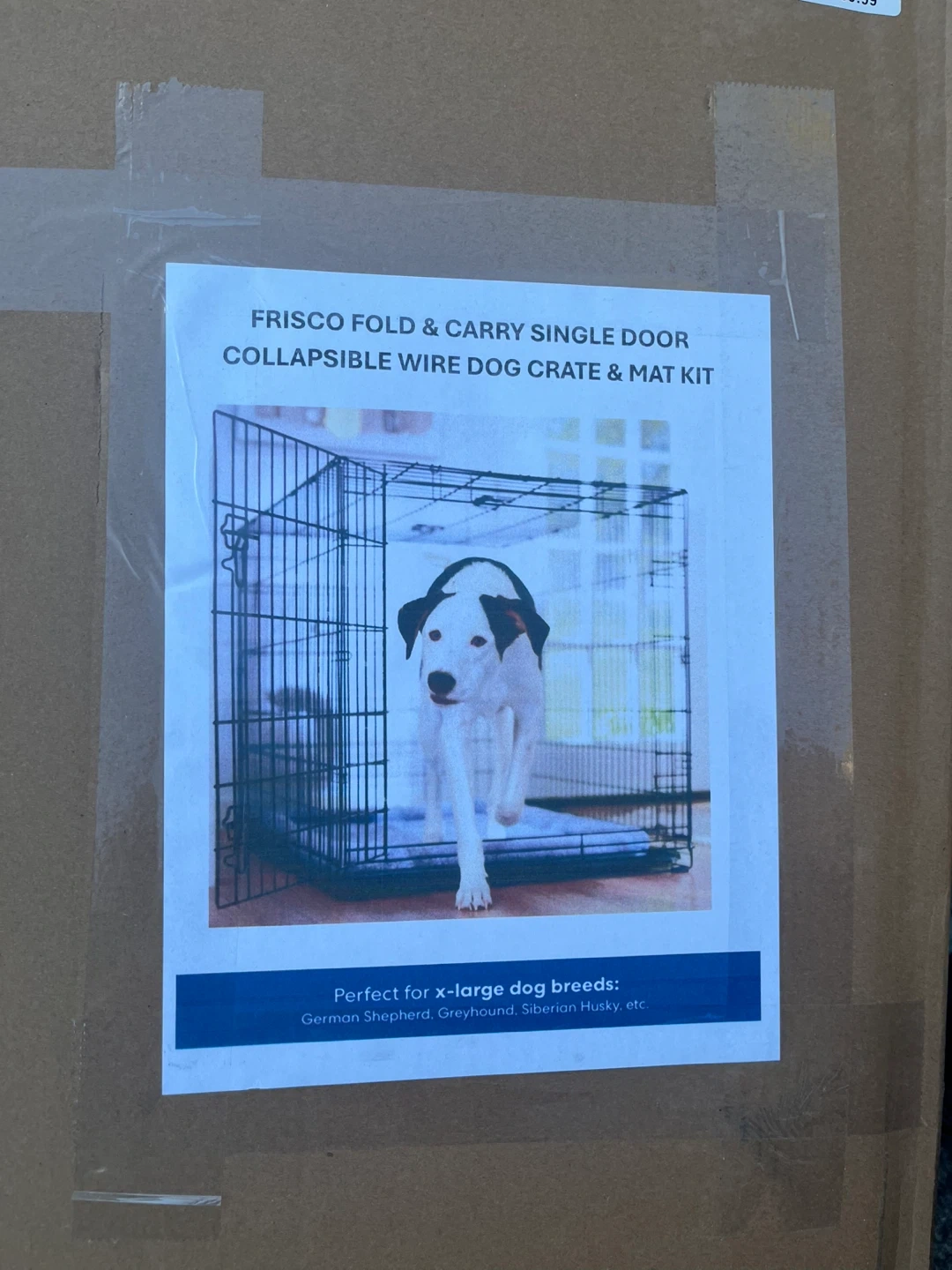 Selling a new in box heavy duty Frisco single door 48-inch dog crate kit! It includes the dog crate and crate mat. The crate dimensions are 48 in L x 30 in W x 32.5 in H (122 cm L x 76 cm W x 83 cm H). Perfect for x-large dog breeds!