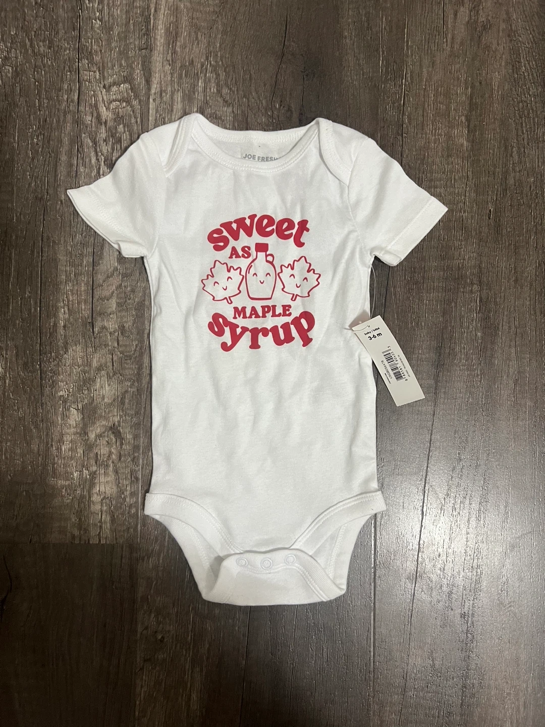 31This adorable Joe Fresh baby onesie is brand new with tags! It's white and features a cute "Sweet as Maple Syrup" design. Size is 3-6 months