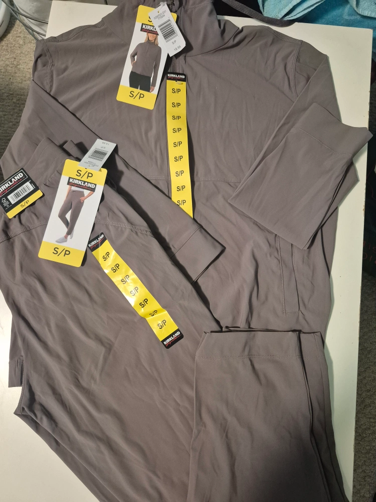 Selling a brand new Kirkland Signature ladies' active set in size S/P. The set includes a jacket and pants, perfect for workouts or casual wear. Never been worn and still has the original tags attached!