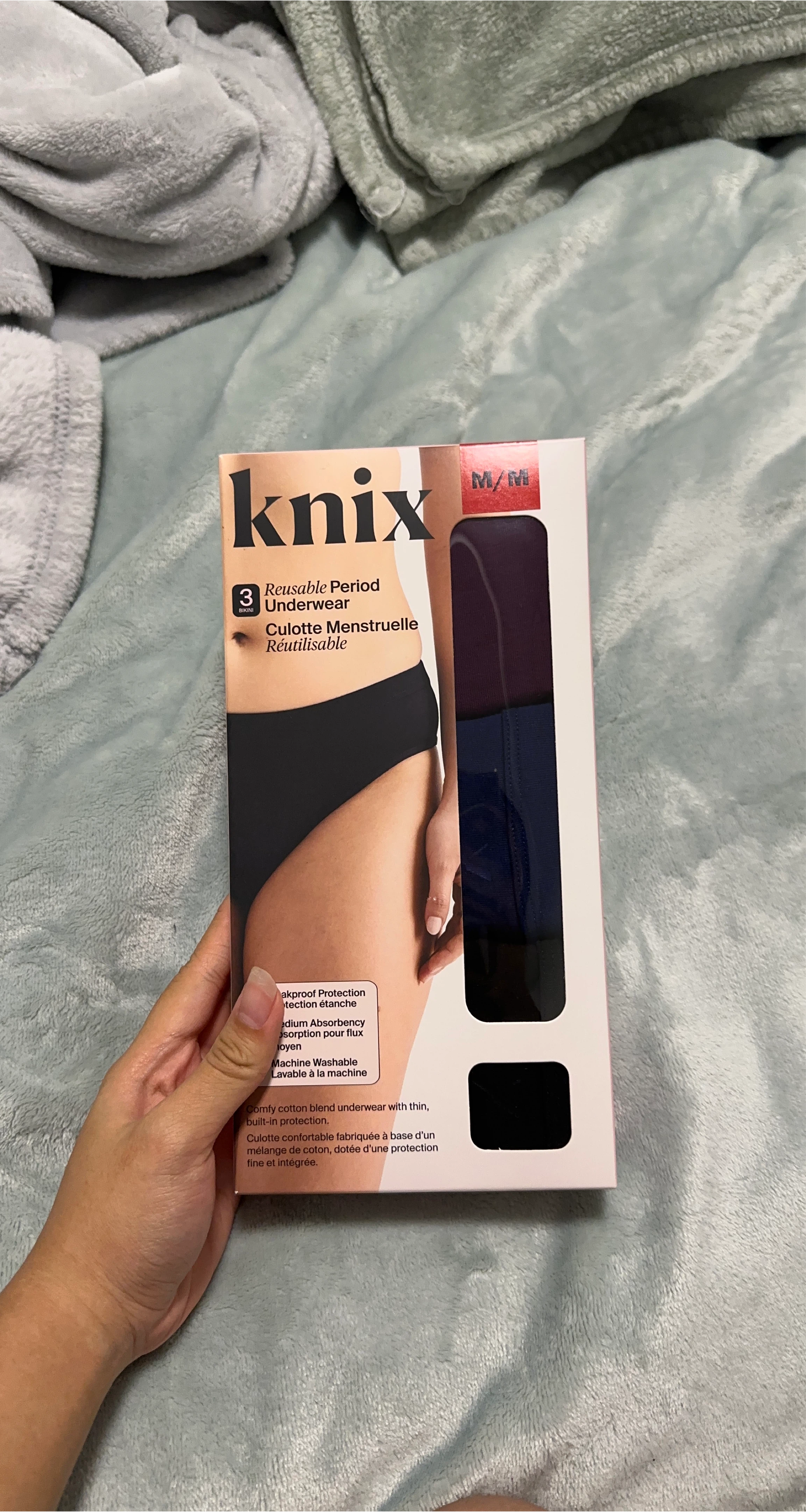 10Selling a brand new pack of Knix reusable period underwear, size M/M. This pack contains 3 pairs of underwear. These are made from a comfortable cotton spandex blend, and are machine washable. Originally bought for $39.99 from Costco!