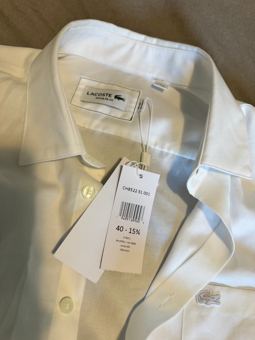 60Selling a brand new Lacoste dress shirt! It's a regular fit, size 40-15 3/4, and made of 100% cotton. The classic white colour makes it super versatile. Never worn, still with tags attached