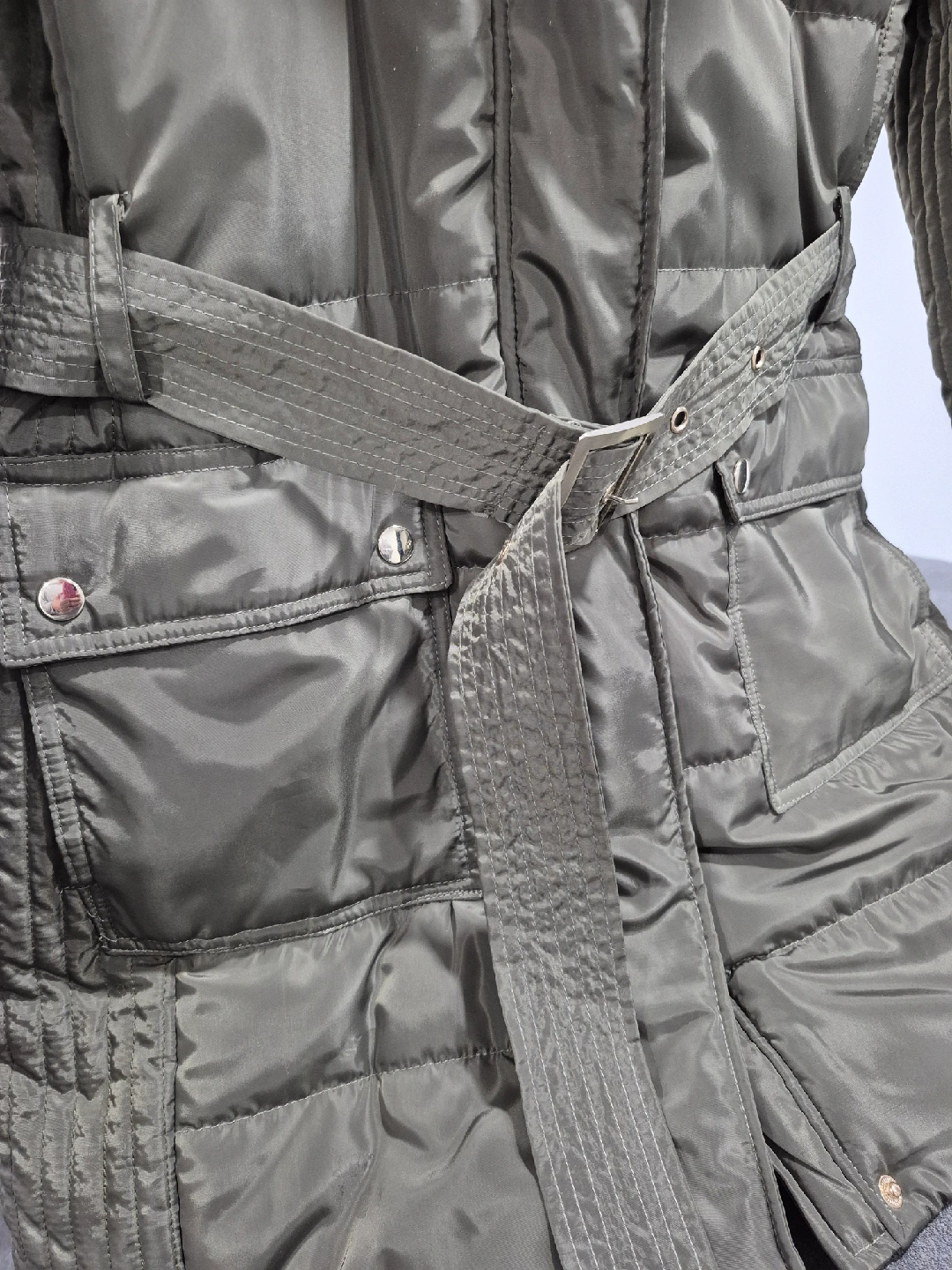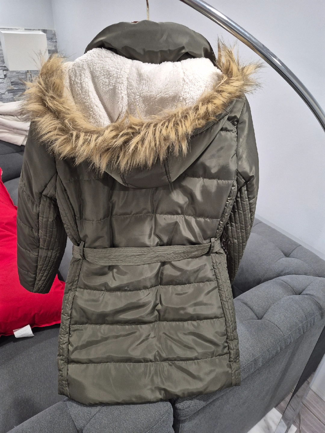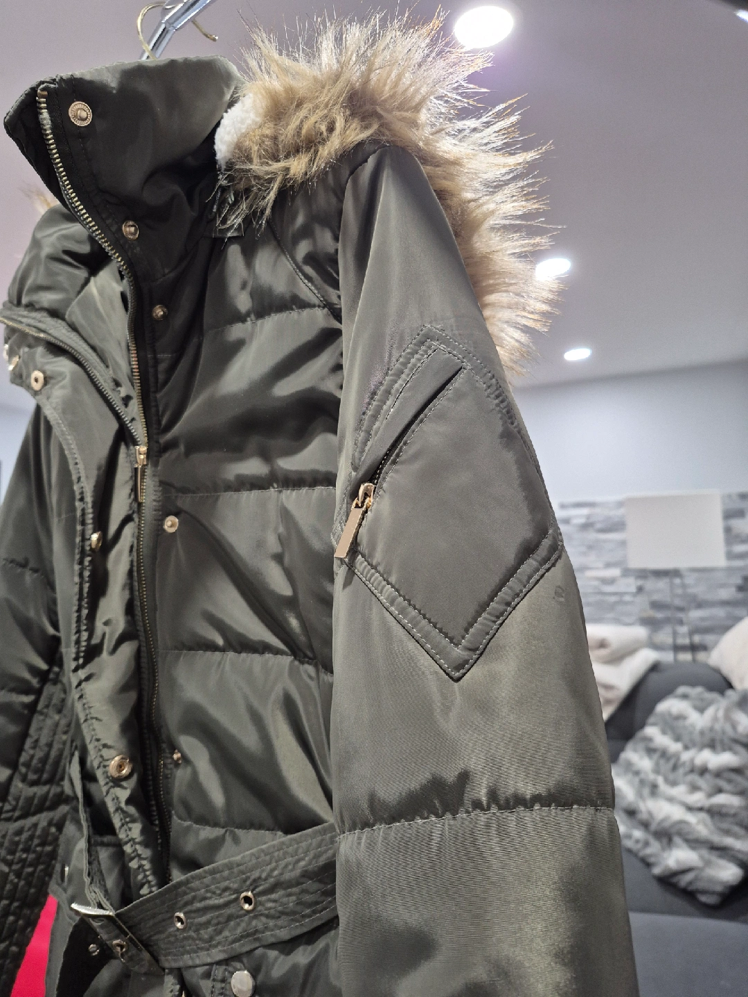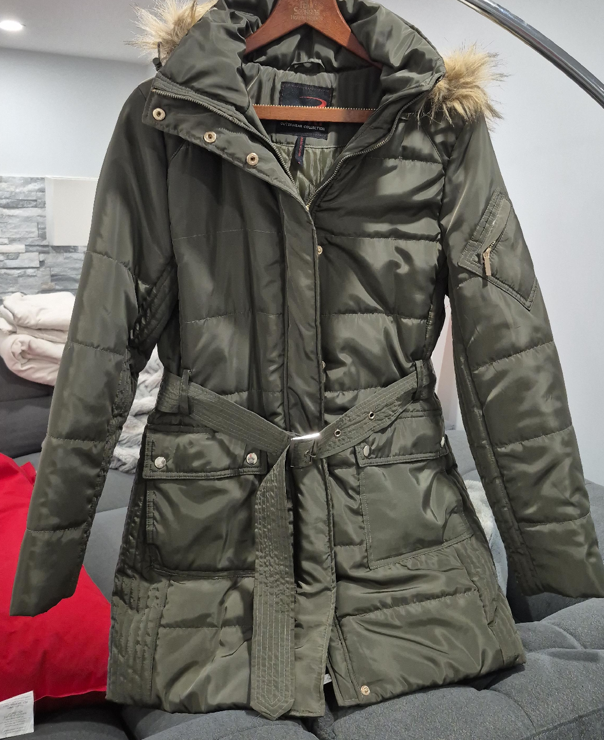 Cozy up this winter with this stylish Outerwear Collection puffer jacket! New, never worn. It's a lovely shade of olive green and features a faux fur-trimmed hood for extra warmth. The jacket also has a belt to cinch the waist and give it a flattering silhouette. Size is Ladies M. Pick up Islington and Queensway.