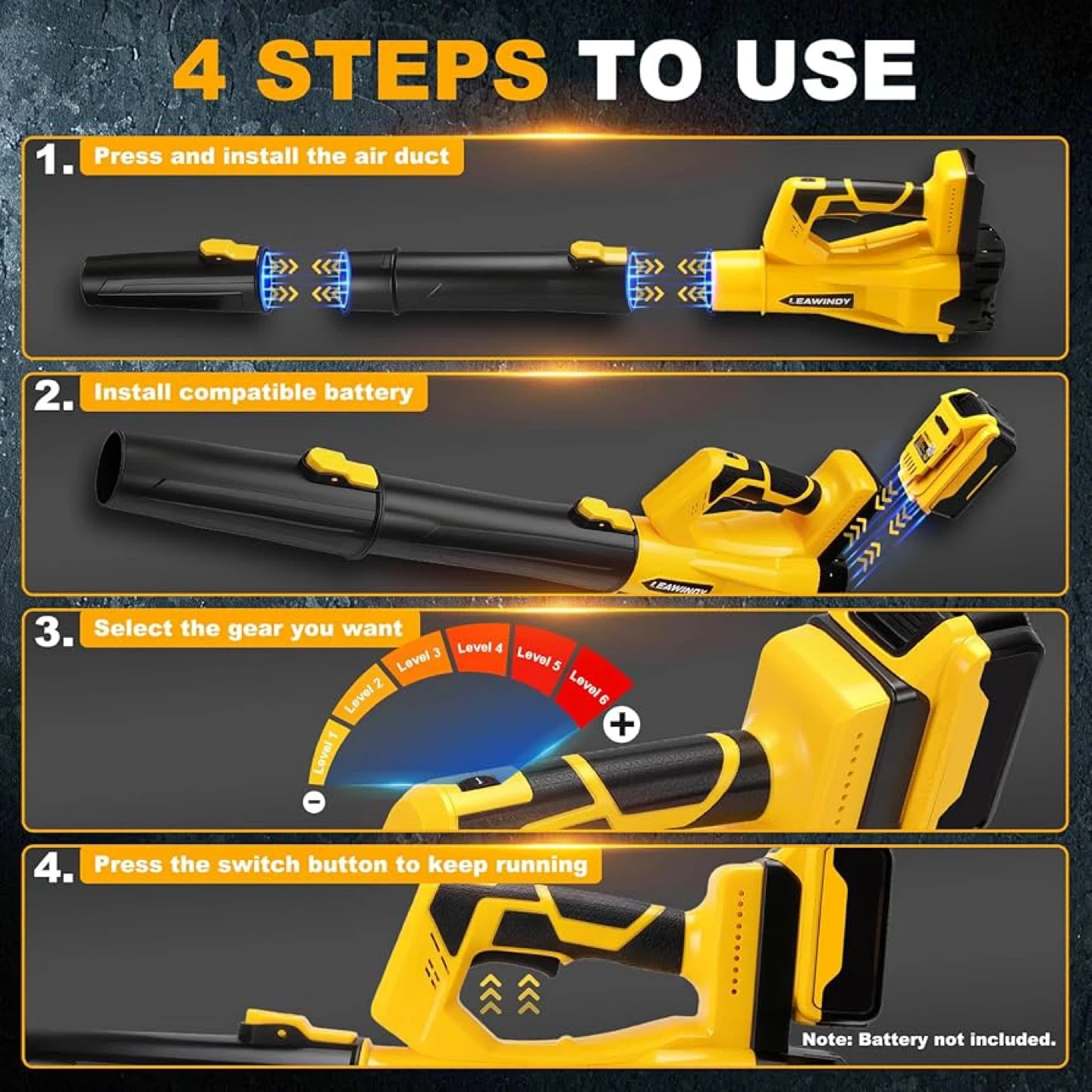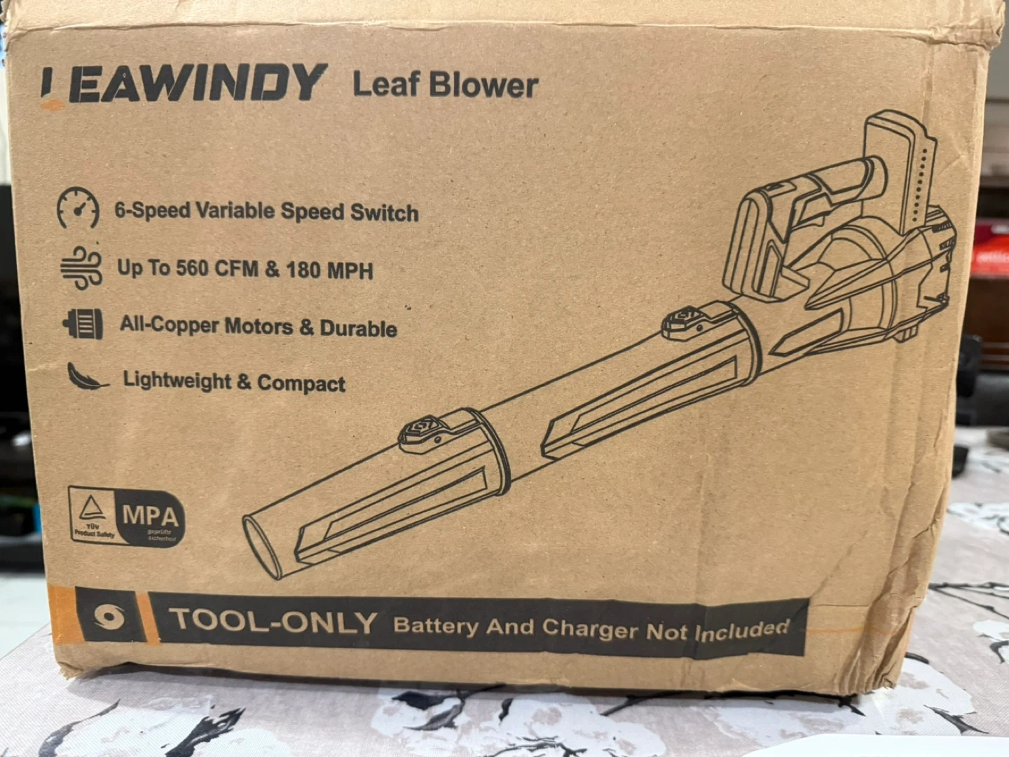 38I have a brand new LEAWINDY cordless leaf blower for sale! It's a tool-only model, so please note that the battery and charger are not included. It features a 6-speed variable speed switch and can reach up to 560 CFM & 180 MPH. The blower is lightweight and compact, making it easy to use and store. Includes the user manual and the box.