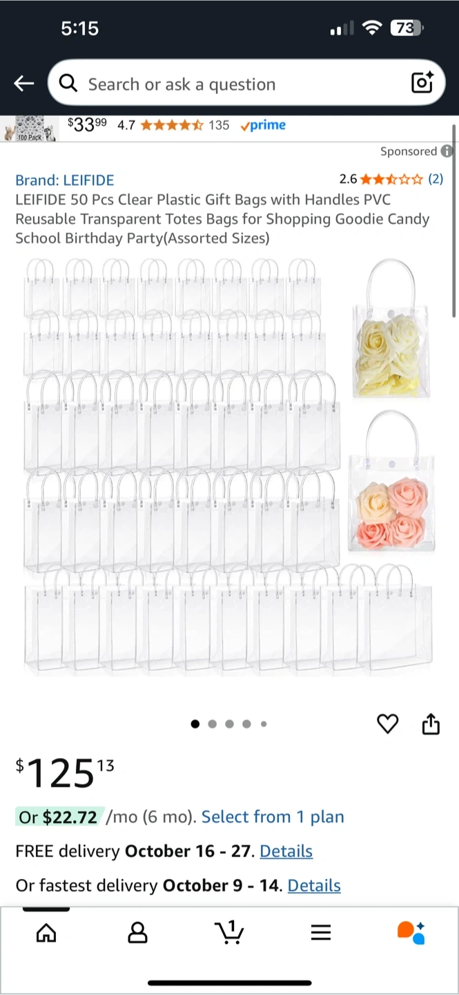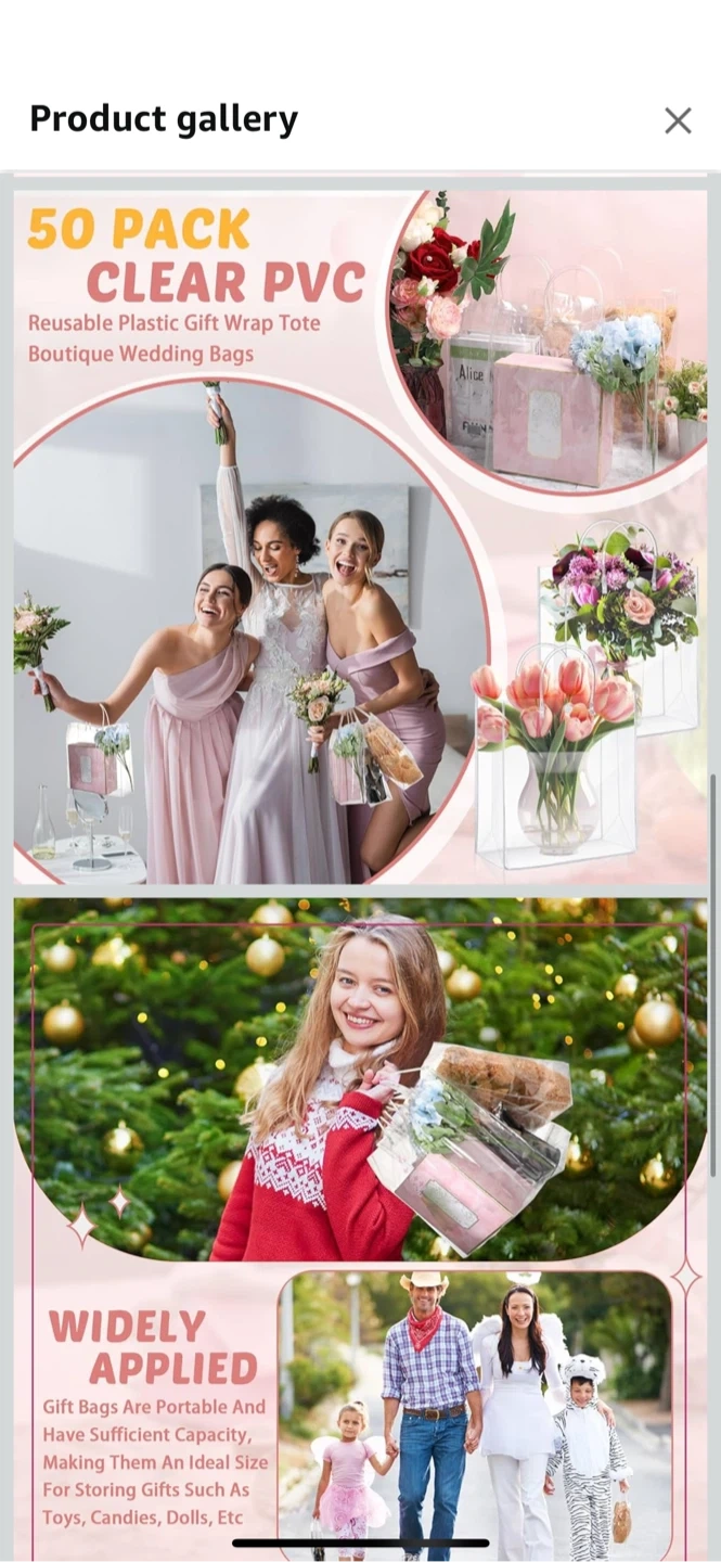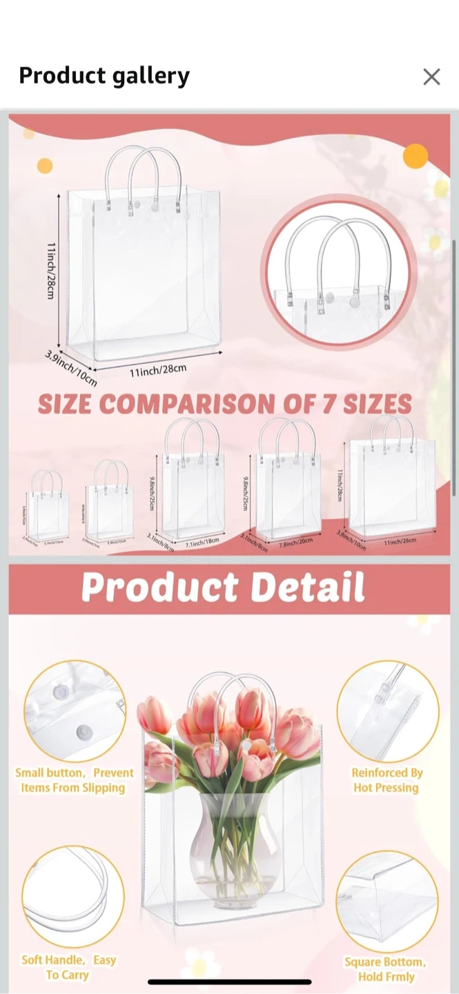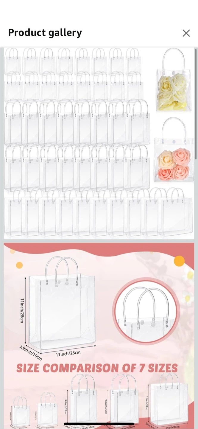Selling a set of 50 clear plastic gift bags from LEIFIDE! These bags have handles and are made of PVC. They're reusable and transparent, perfect for shopping, goodie bags, candy, school birthday parties, and more. They come in assorted sizes, and I original selling price is 125.13 Comes with 50 bags . Brand new never used Sizing is in photos