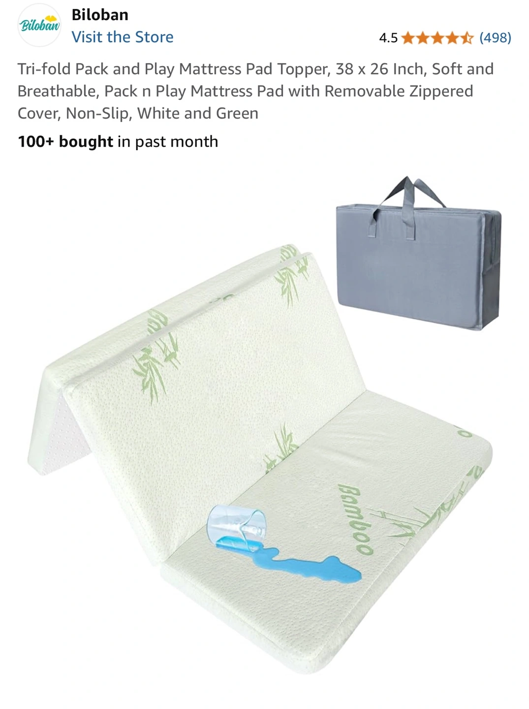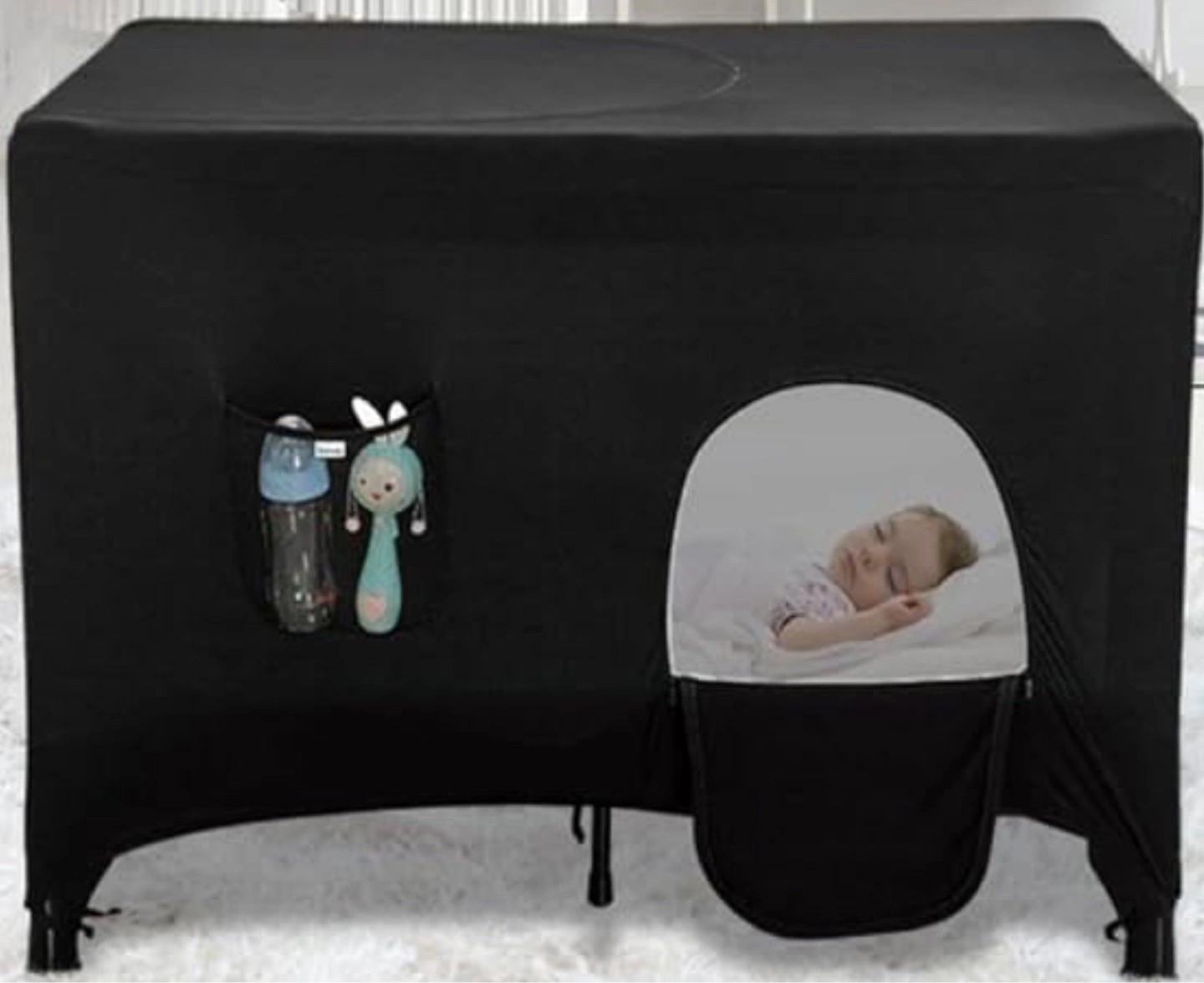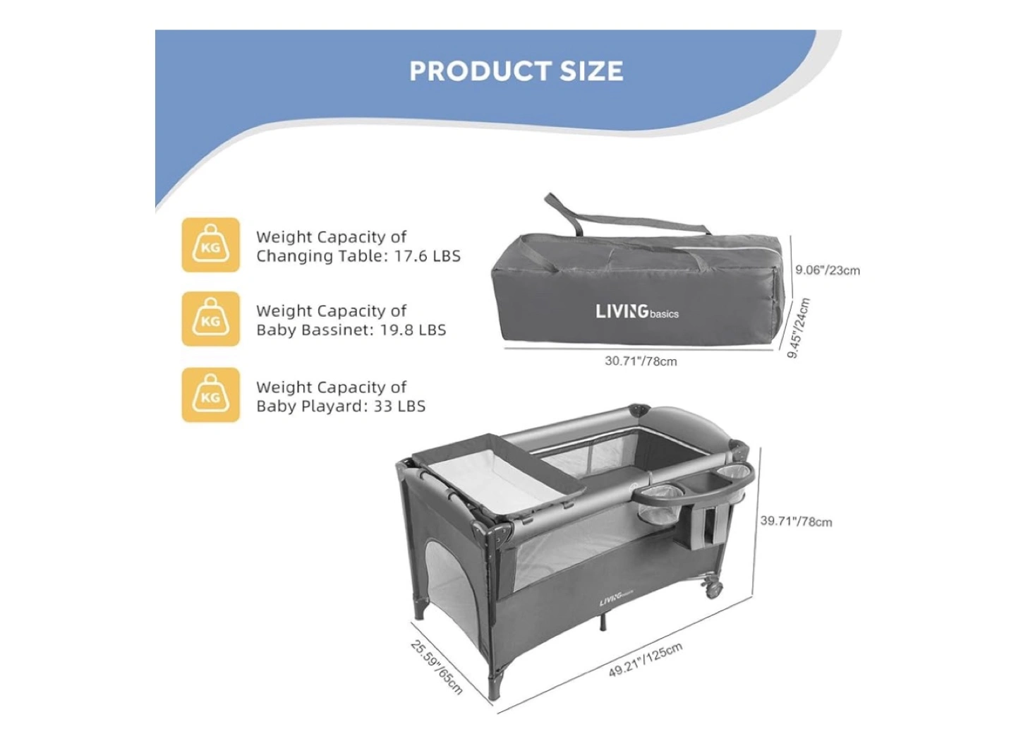 NEW; Portable playard, bassinet and changing station. Includes carrying bag. Weight capacities: changing table 17.6 lbs, bassinet 19.8 lbs, playard 33 lbs. Oversized 25.59โ x 49.21โ x 39.71โ . Biloban Tri-fold Pack and Play Mattress Pad. Soft, breathable, non-slip. Removable zippered cover. Included Jonnick Slumber Crib Blackout Canopy Cover. Black. Stretchy, breathable. Portable. For pack n plays. 5 new fitted sheets