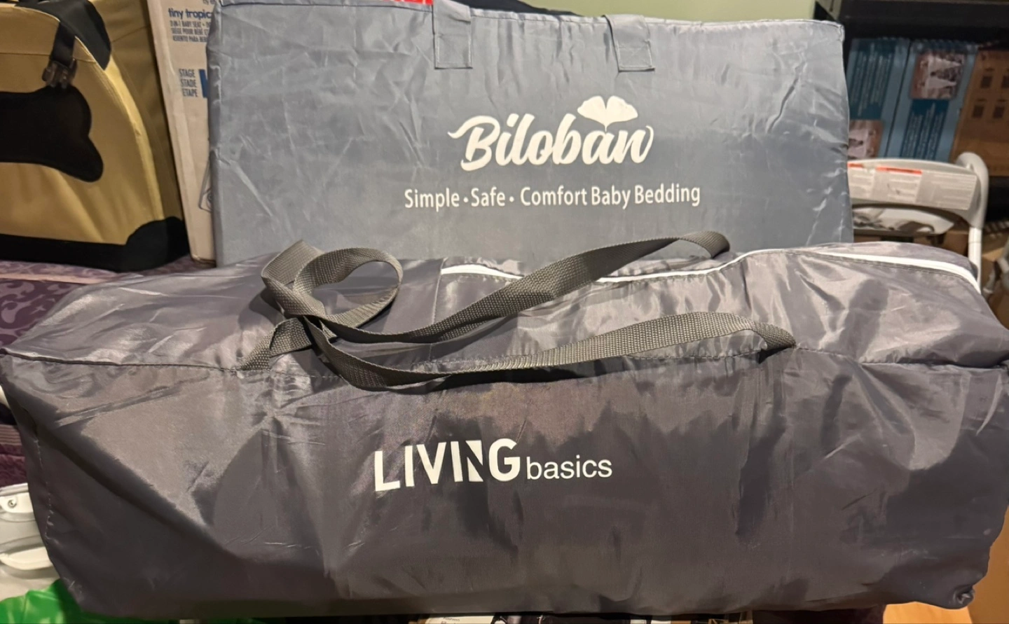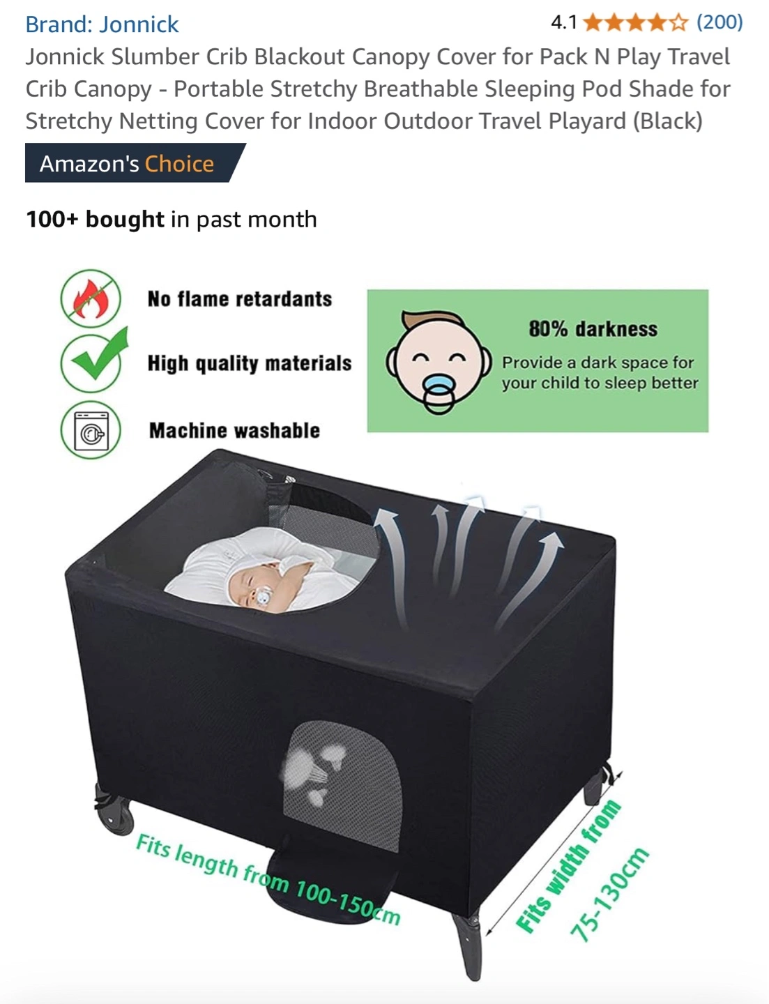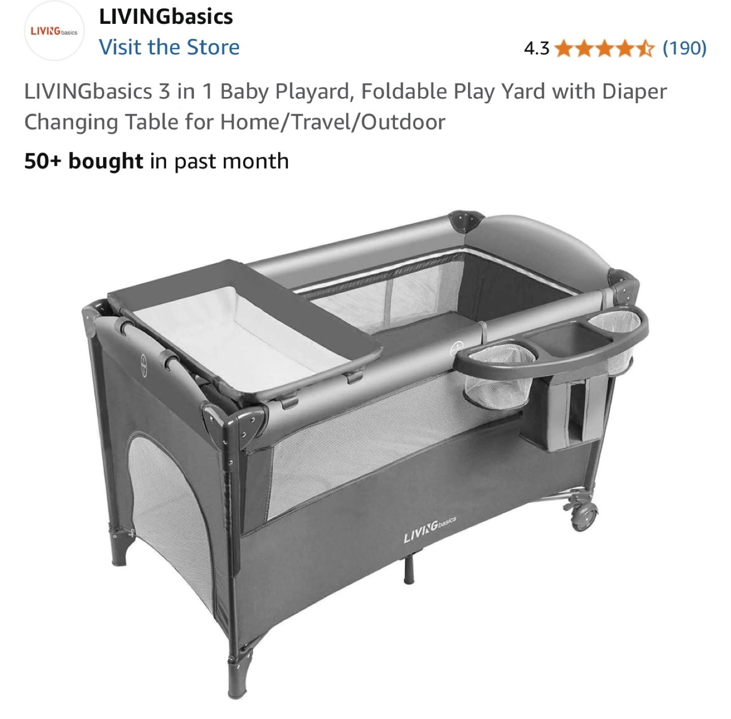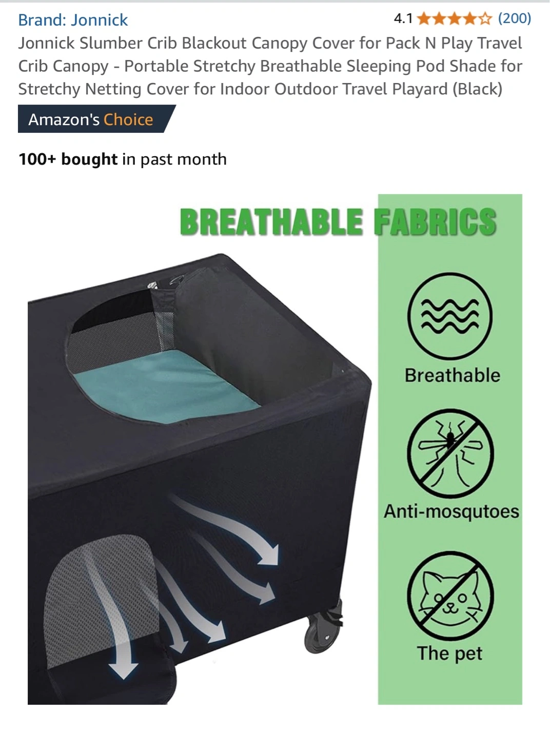 NEW; Portable playard, bassinet and changing station. Includes carrying bag. Weight capacities: changing table 17.6 lbs, bassinet 19.8 lbs, playard 33 lbs. Oversized 25.59โ x 49.21โ x 39.71โ . Biloban Tri-fold Pack and Play Mattress Pad. Soft, breathable, non-slip. Removable zippered cover. Included Jonnick Slumber Crib Blackout Canopy Cover. Black. Stretchy, breathable. Portable. For pack n plays. 5 new fitted sheets