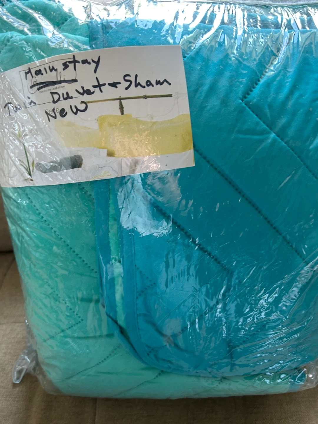 10Selling a brand new Mainstay twin duvet and sham set! It's still in the original packaging, never been opened or used. The set includes one duvet cover and one matching pillow sham. Perfect for adding a fresh pop of colour to your bedroom!