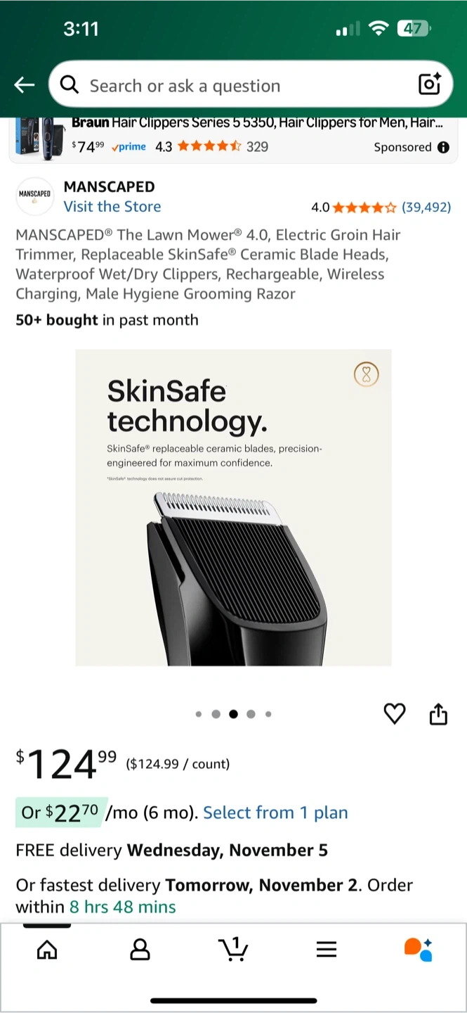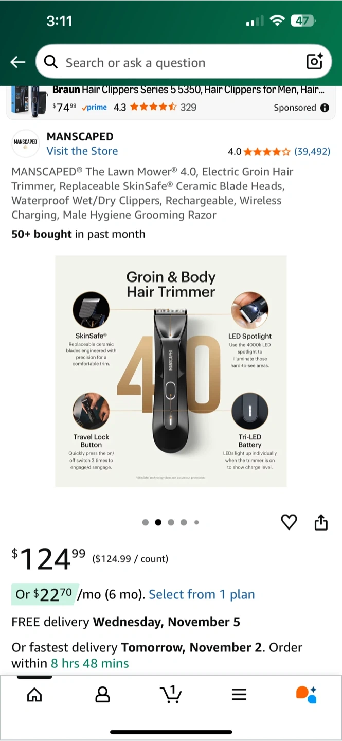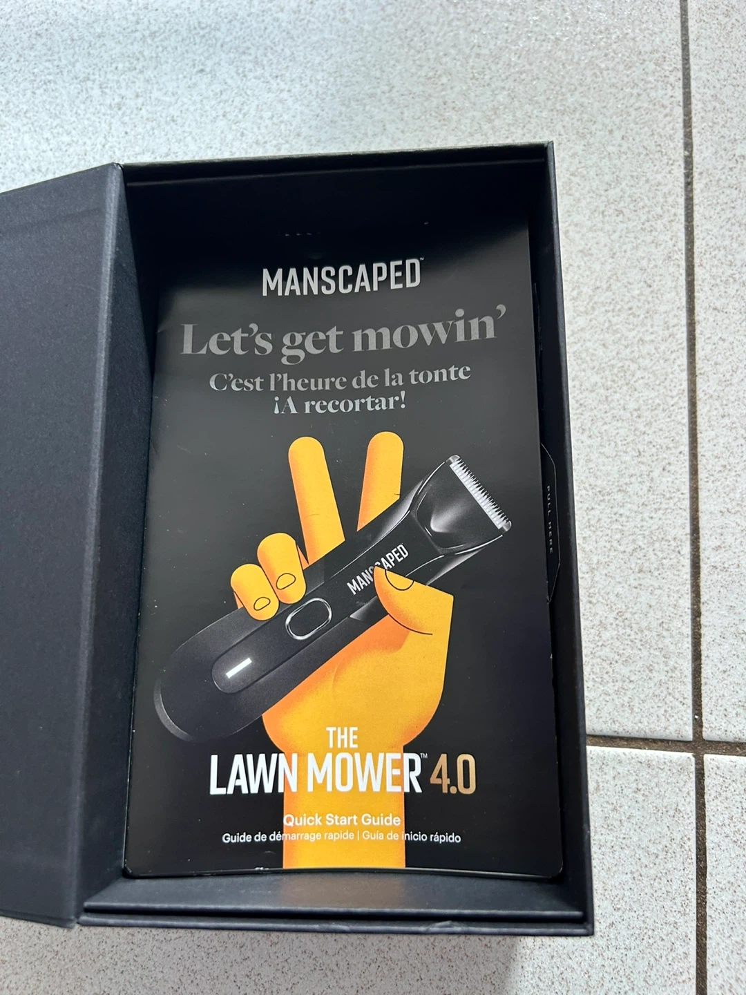 1000+I'm selling a brand new MANSCAPED® The Lawn Mower™ 4.0! It's an electric groin hair trimmer with SkinSafe® technology. The trimmer has replaceable ceramic blade heads, is waterproof, and can be used for wet/dry clipping. It's rechargeable and has wireless charging. The box and a quick start guide are included. New in box never used.