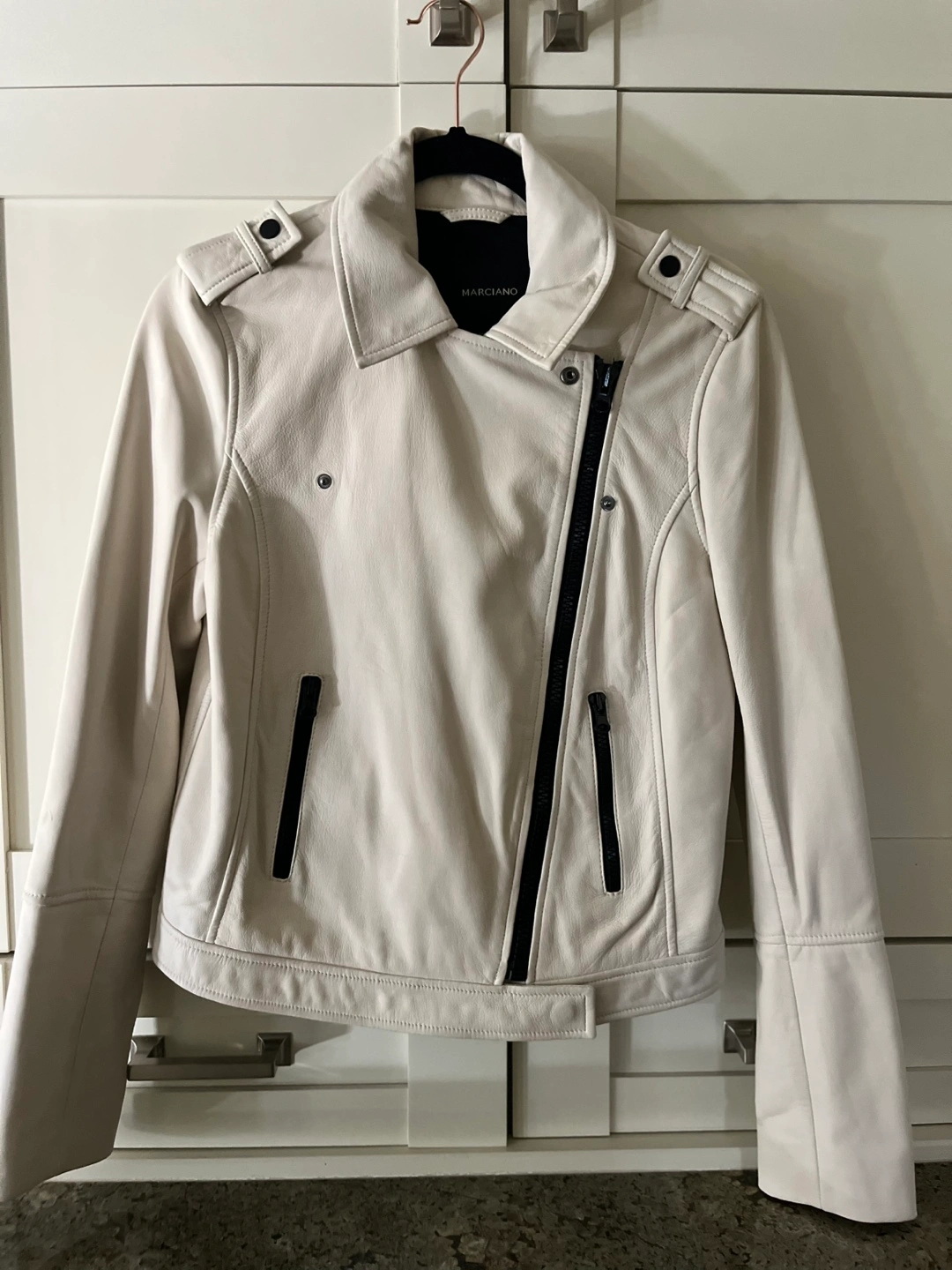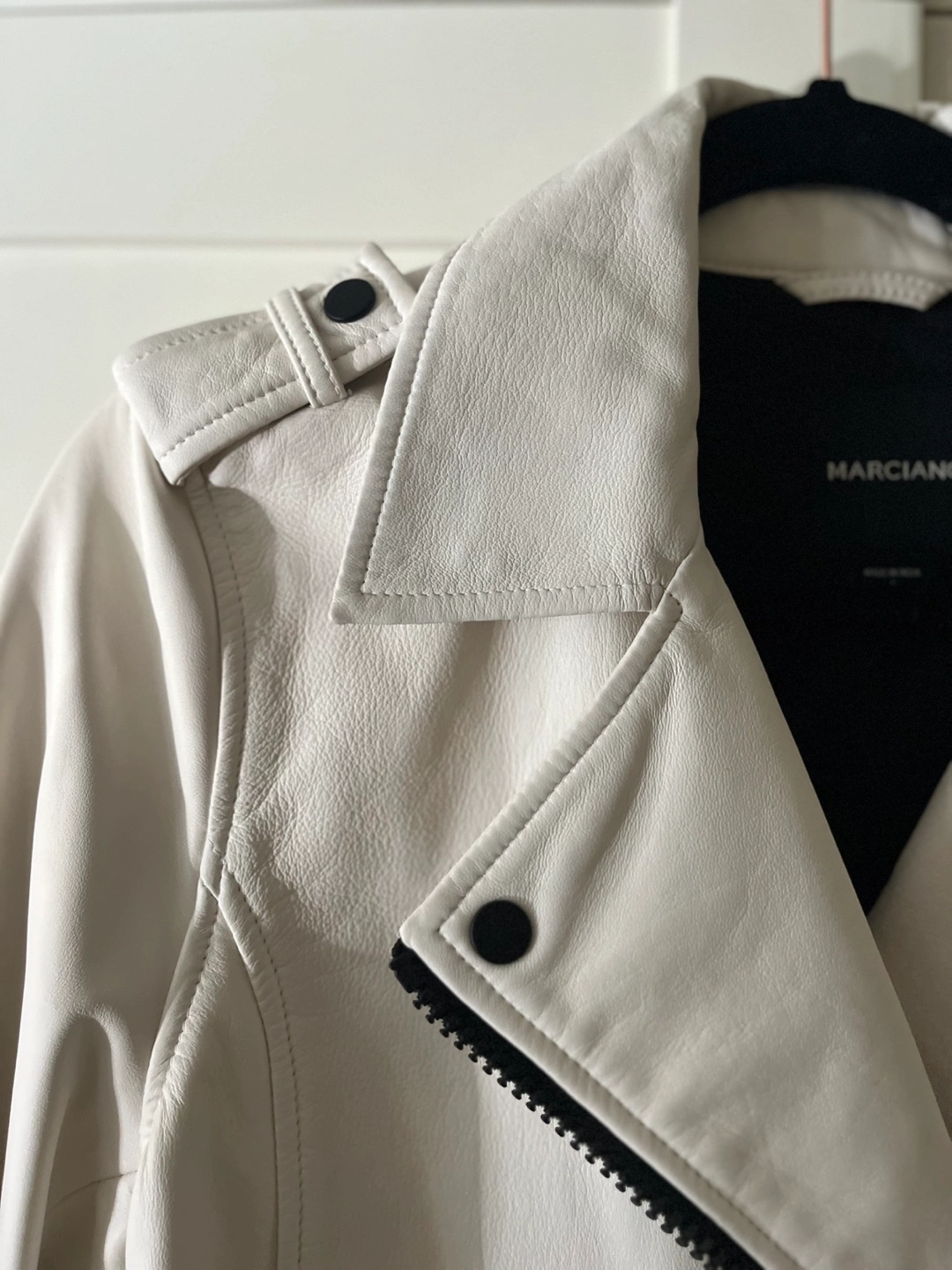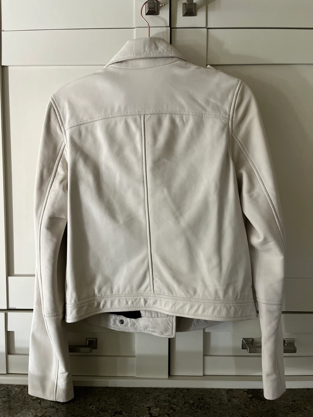 36Women's off-white leather moto jacket. Asymmetrical zipper closure. Features black detailing. Long sleeves. Cropped length.