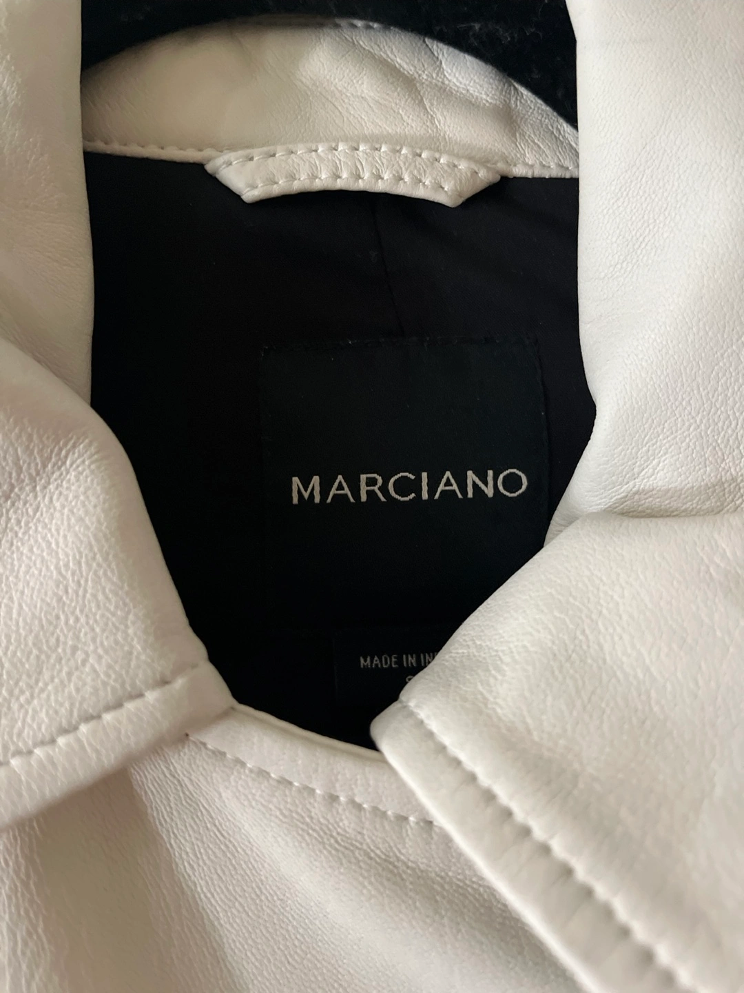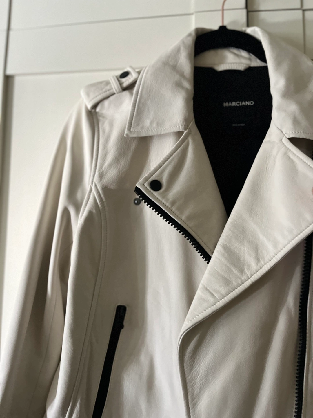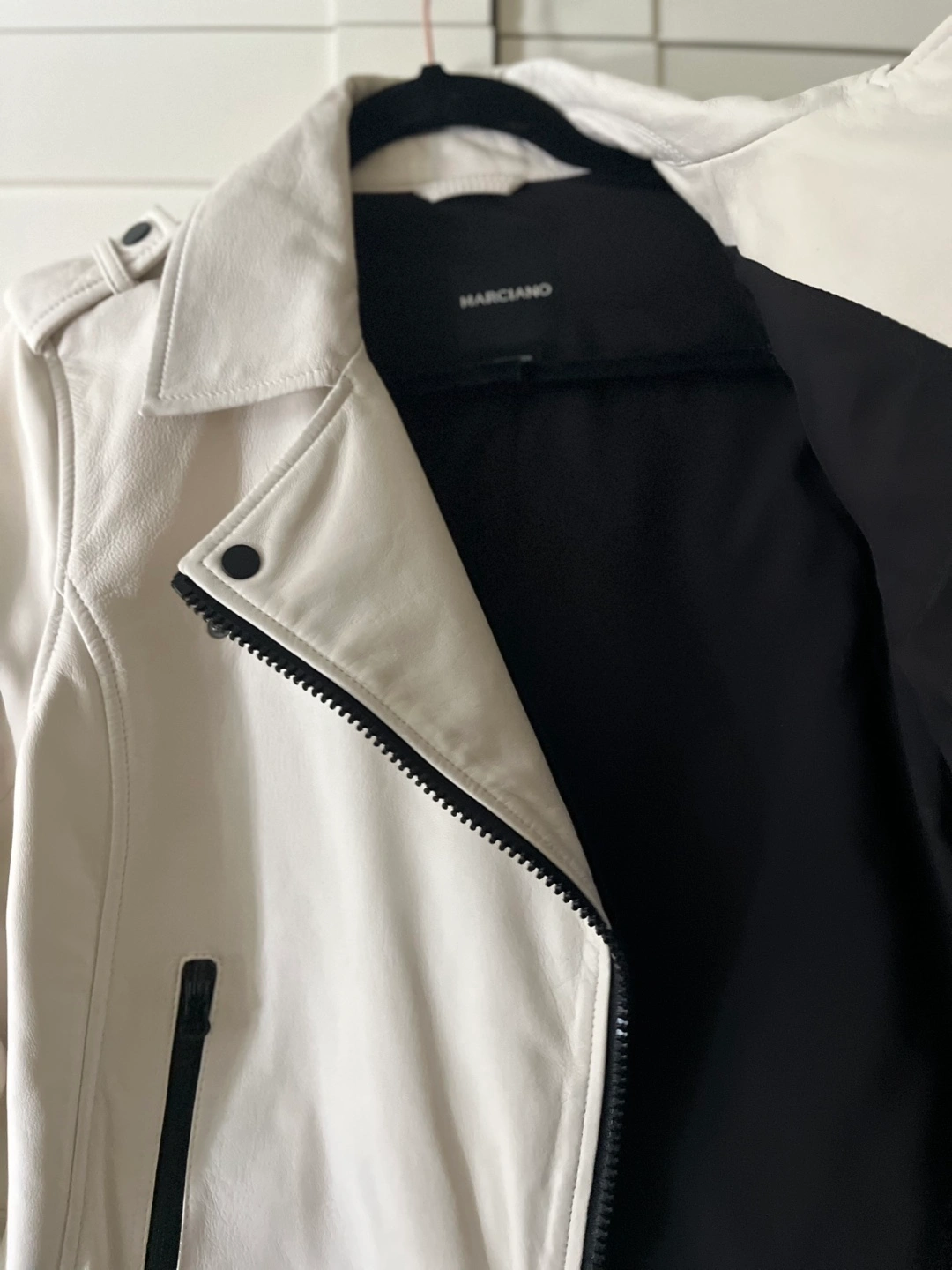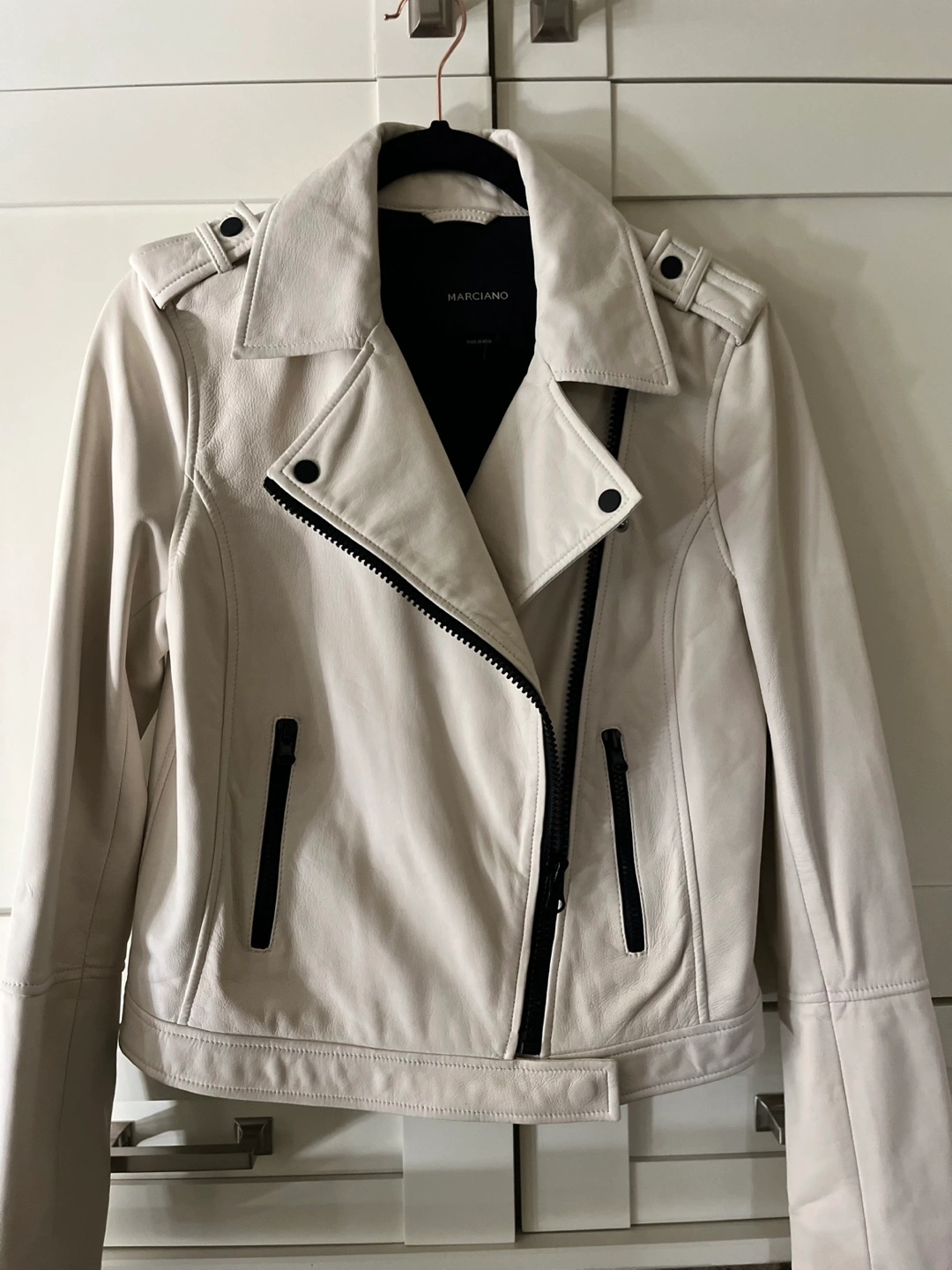 36Women's off-white leather moto jacket. Asymmetrical zipper closure. Features black detailing. Long sleeves. Cropped length.