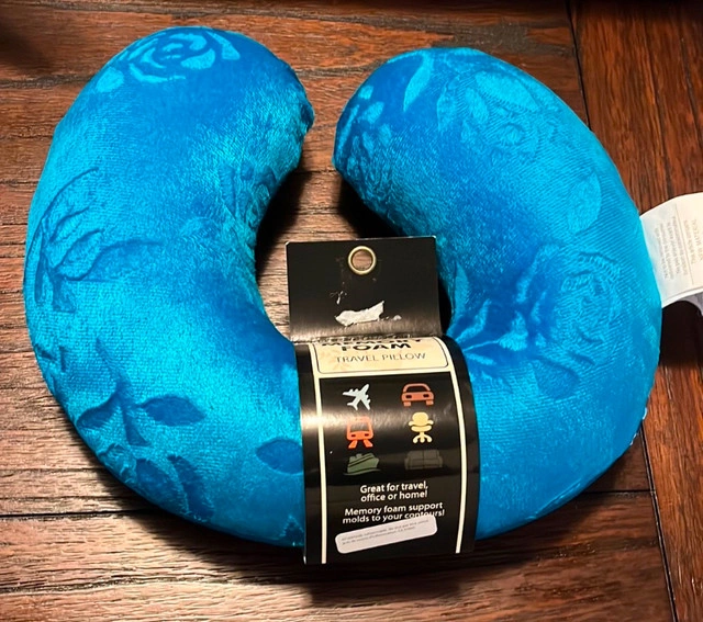 Brand new memory foam travel pillow. Beautiful bright teal blue color with a floral rose pattern. Soft, velvety feel. Polyester and polyeurethane. Zippered cover is removable and washable. Life is Soft brand. Supports neck while sleeping in the airplane, car, and more. Never used, still has tags. $20. Near the Burlington/Oakville border.