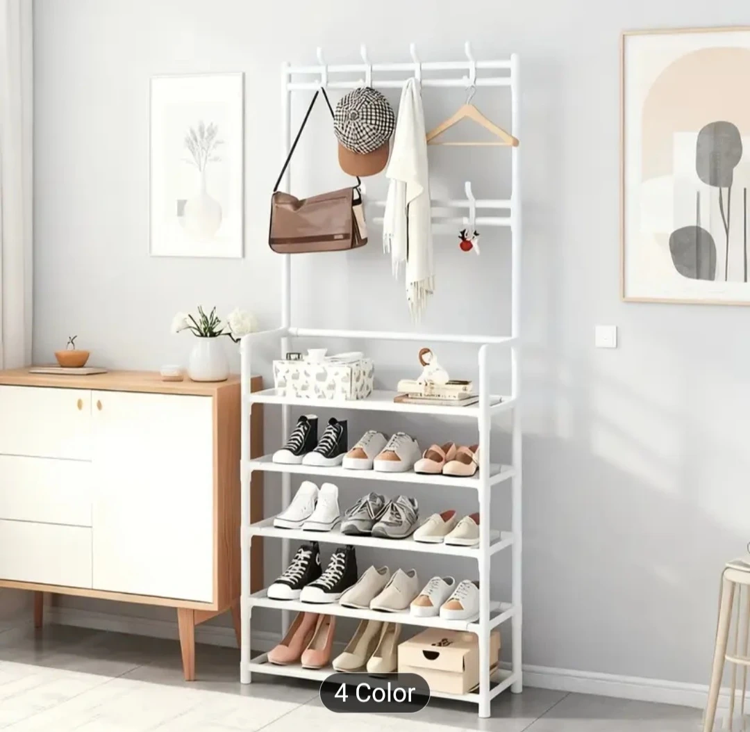 222New in the box Freestanding White 4 ROW shoe storage and coat rack. Multiple shelves for shoes. Metal frame. Durable construction. Easy assembly. meeting place is near mavis and steels