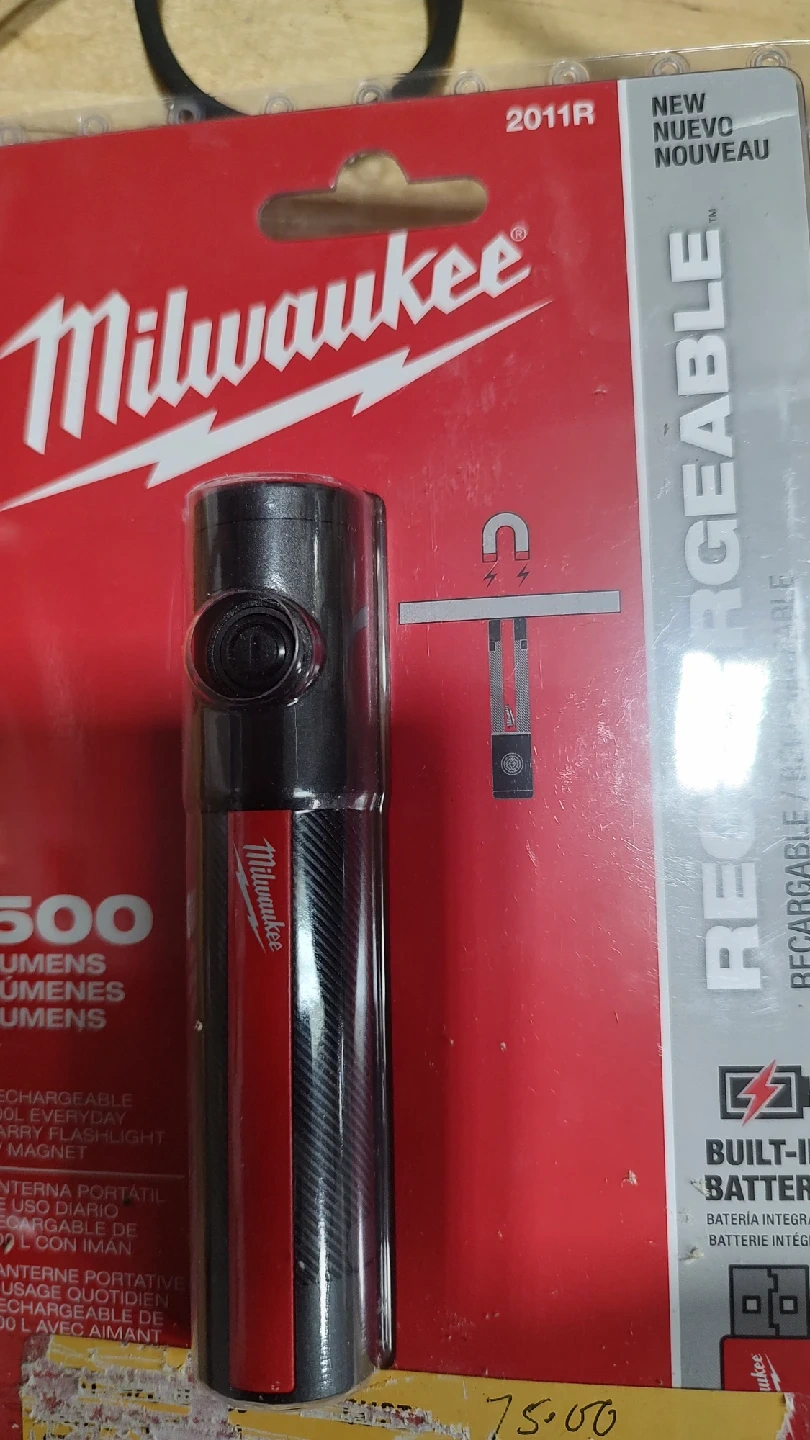 49Selling a brand new Milwaukee 2011R rechargeable flashlight! It's still in its original packaging. This flashlight features: - 500 Lumens - Rechargeable - Everyday Carry Flashlight - Magnet Includes a 20cm / 8" Micro USB Cable. Originally bought for $75.00