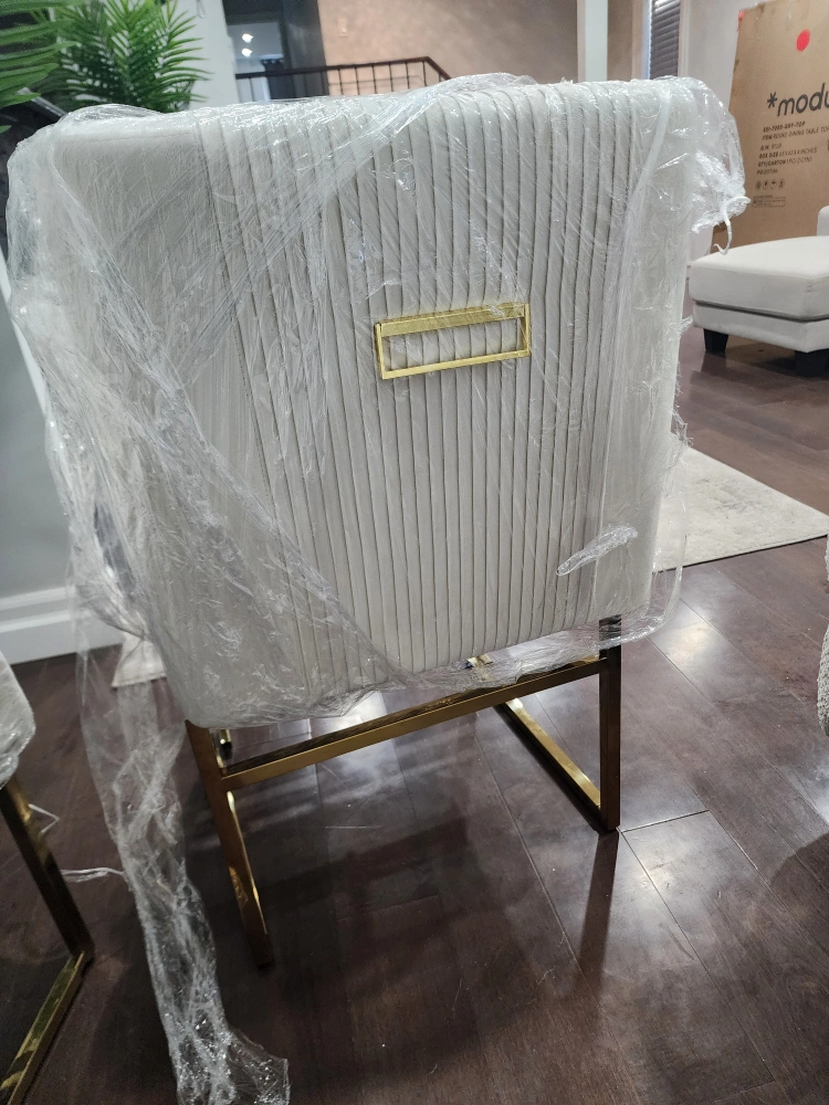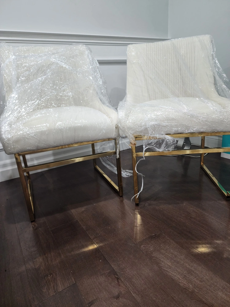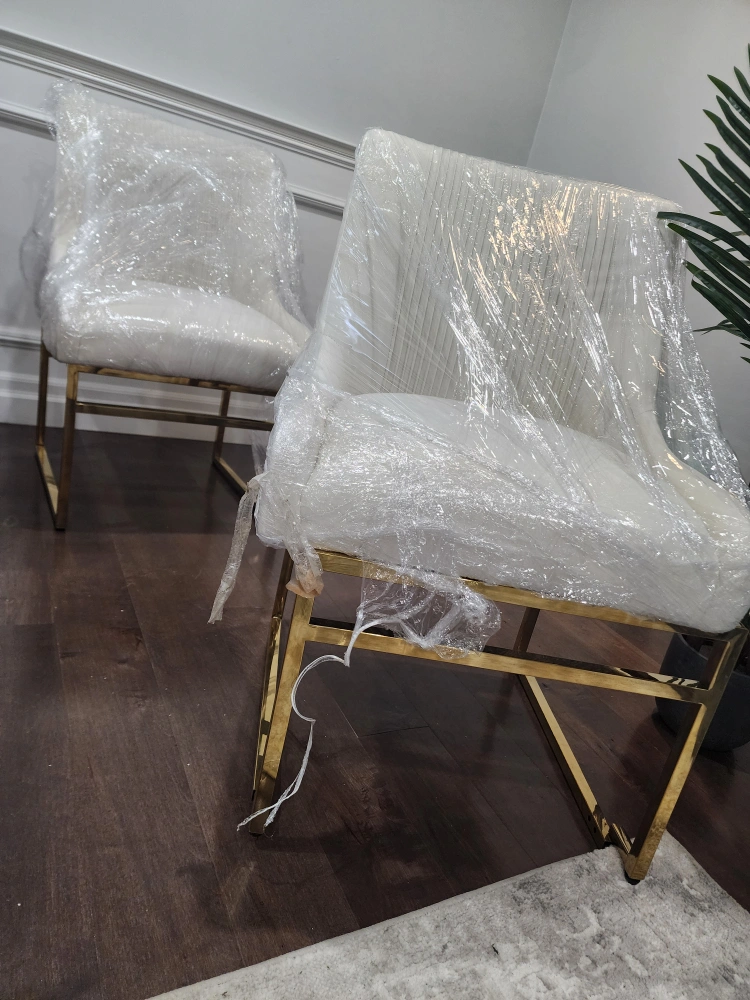 Selling a set of two brand new modern dining chairs! They are still wrapped in plastic. The chairs have a white seat and back with gold legs. They would look great in any dining room or office.