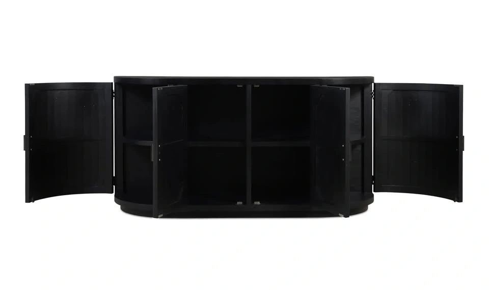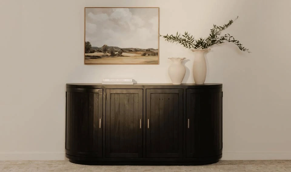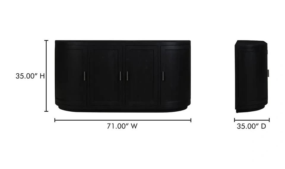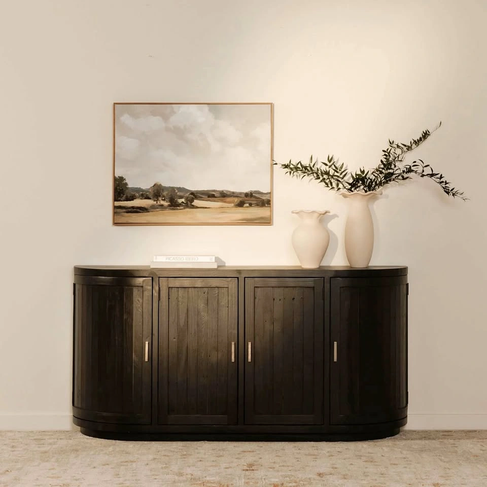 Beautiful statement piece with plenty of storage! REGULAR RETAIL $2449.00 Colour: Black Rustic charm meets modern style in this stunning Nicola sideboard, made from reclaimed pine wood. The curved cabinet doors add a soft, stylish touch, while the recessed base gives it a sleek, contemporary look — perfect for transitional spaces. ✔️ Smooth curved doors with minimalist handles ✔️ Spacious interior storage ✔️ Solid and well-built (over 90 lbs!) ✔️ Great for dining rooms, entryways, or living areas 📏 Dimensions: Length: 71" Width: 17.7" Height: 35" Weight: 93.5 lbs