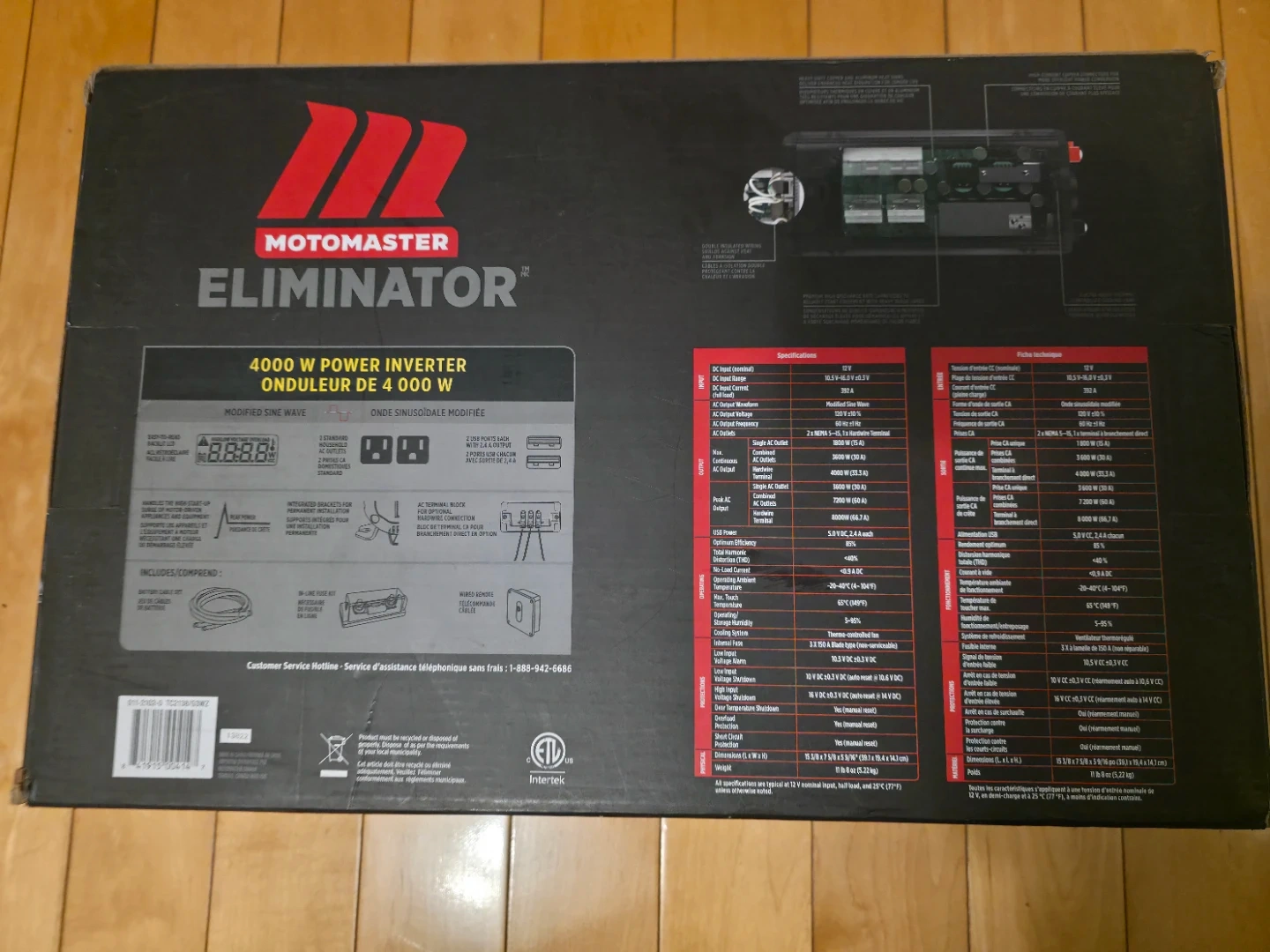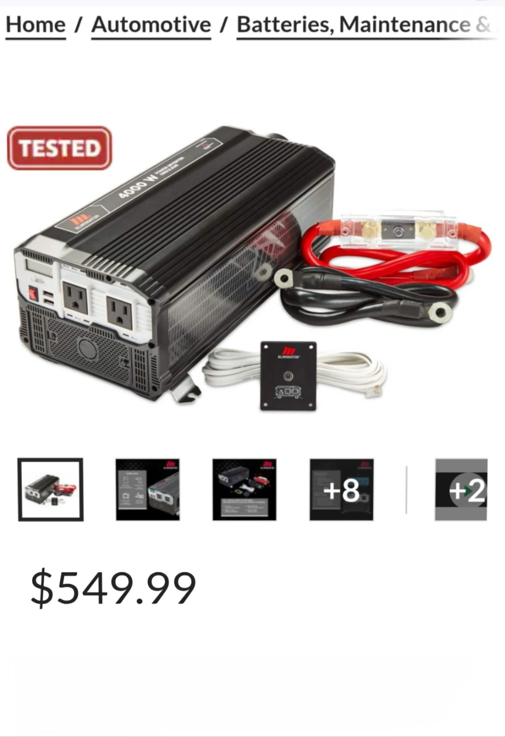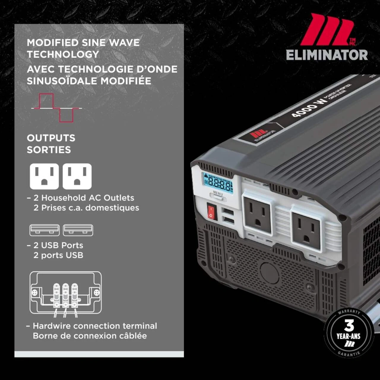 10BRAND NEW IN BOX. Also have 1500w pure sine inverters, check my other listings. Pickup in Markham (16th & McCowan). The MotoMaster Eliminator Power Inverter delivers 4000 watts of AC power, converting your DC battery source into reliable electricity for appliances, tools, and more. Perfect for RVs, boats, jobsites, or tailgating, its modified sine wave output ensures compatibility with most electronics. Overload protection and a built-in cooling fan enhance safety and performance. Includes a battery cable, fuse kit, and wired remote for added convenience and control. -Converts 12V DC battery power into 120V AC power - up to 4000 total watts continuous; 8000 total watts peak (surge/startup) -Ideal for emergency backup power and anywhere else you need household electricity to power equipment -2 x standard North American AC outlets and 2 x USB ports (2.4A each) -Easy-to-read backlit LCD display indicates battery level, input battery voltage, output wattage and fault conditions -Features an optional hardwire output for applications that draw more than 15 amps -Heavy-duty copper and aluminum heat sinks and three ultra quiet thermal-controlled cooling fans deliver enhanced heat dissipation for longer life -High performance capacitors reliably handle the high start-up surge of motor-driven appliances and equipment -Microprocessor-control protects against low input voltage, high input voltage, short circuit, overload and over-temperature -Integrated mounting brackets allow for permanent installation -Low no-load current draw (less than 0.9A DC) -Comes ready to install with 3' battery cables, inline fuse kit and 20' wired remote