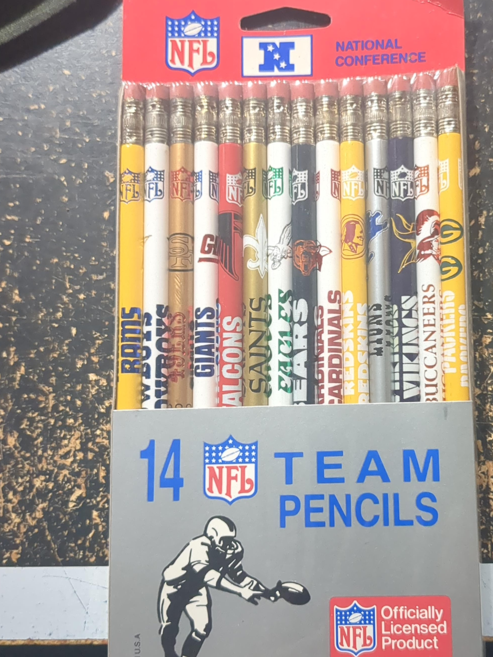 I'm selling a set of 14 NFL team pencils, still in the original packaging! Each pencil features a different NFL team logo. A great collector's item for any football fan!