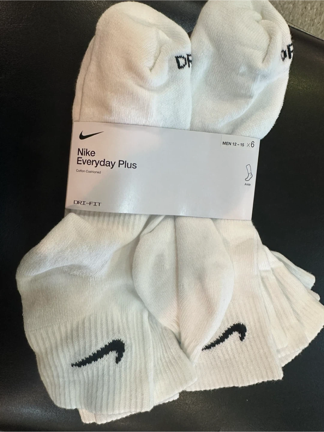 10Selling a pack of brand new Nike Everyday Plus ankle socks. They are men's size 12-15 and come in a pack of 6. These socks are cotton cushioned and feature Dri-FIT technology to keep your feet comfortable and dry