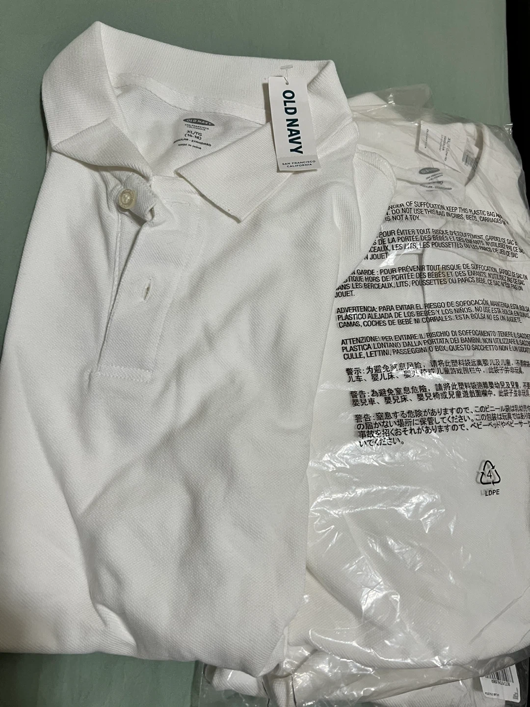 10I have two brand new Old Navy white polo shirts, still in their original packaging! They're size 12/14 (Regular Standard). Great for school uniforms or everyday wear!