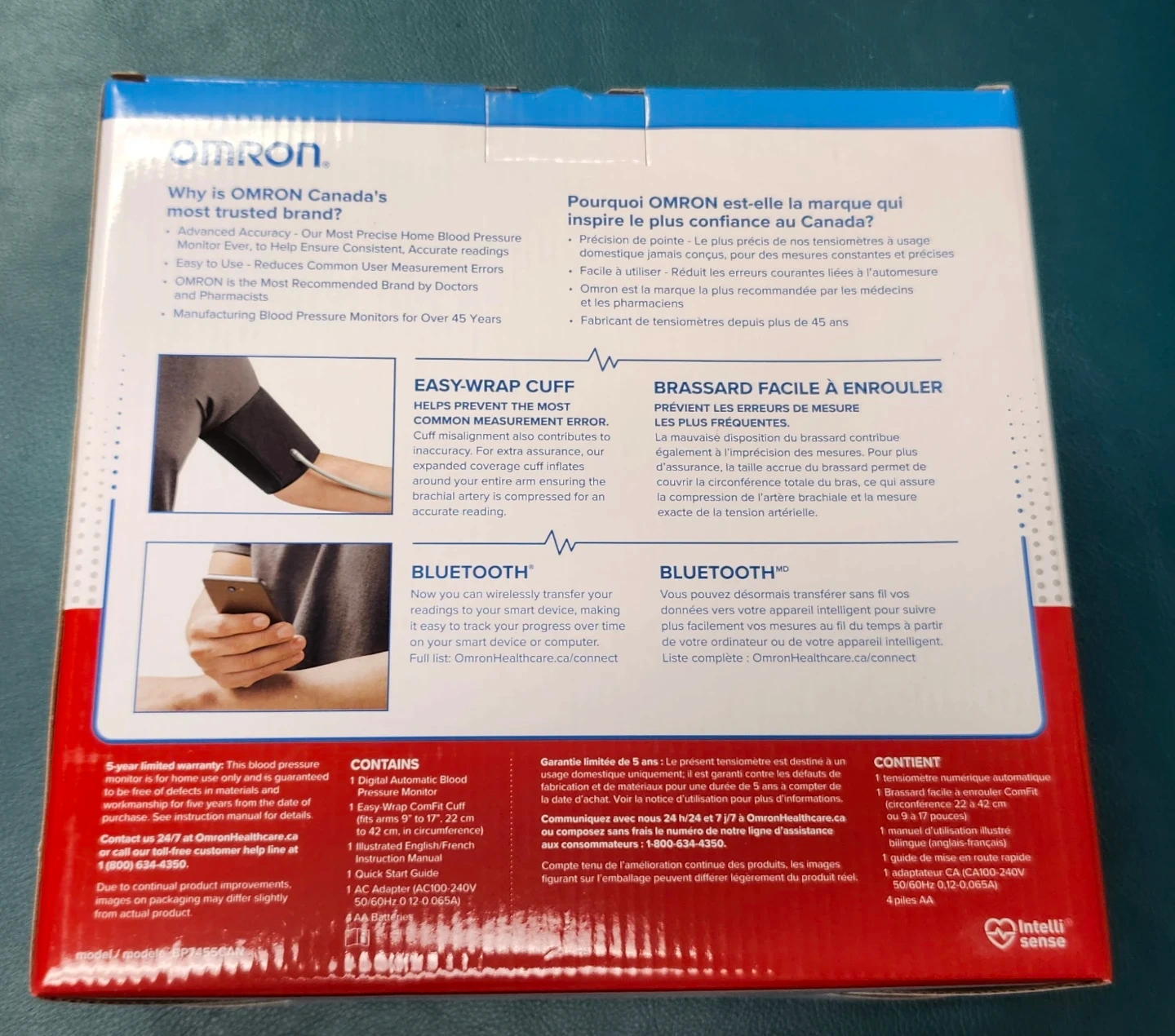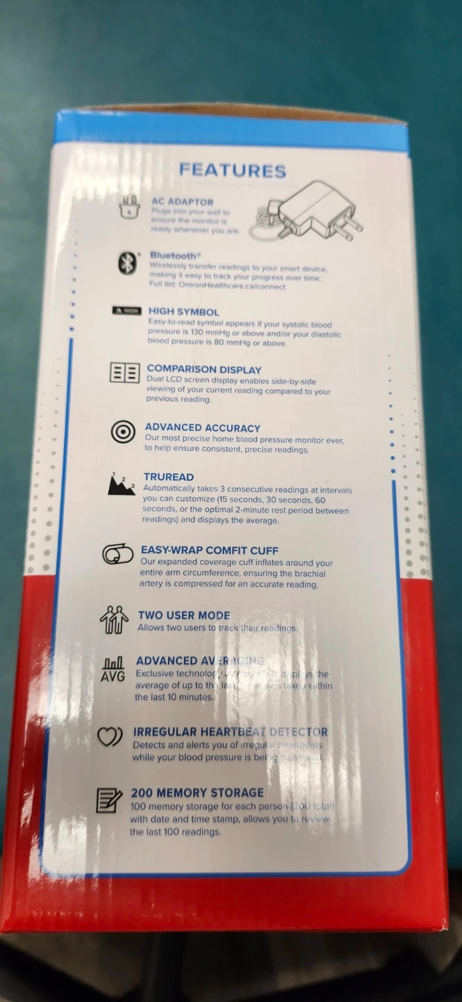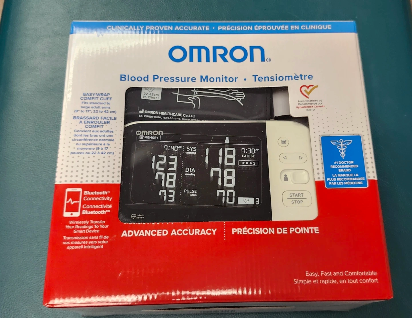 65Selling a brand new Omron Blood Pressure Monitor, model BP7455CAN! It comes in its original box and includes all components like the digital automatic blood pressure monitor, easy-wrap Comfit cuff (fits arms 9" to 17" or 22 to 42 cm), AC adapter, quick start guide, and instruction manual Retails at $100 on Costco. Features include: - Bluetooth connectivity - Advanced accuracy - Easy-wrap Comfit cuff - Irregular heartbeat detector - 200 memory storage