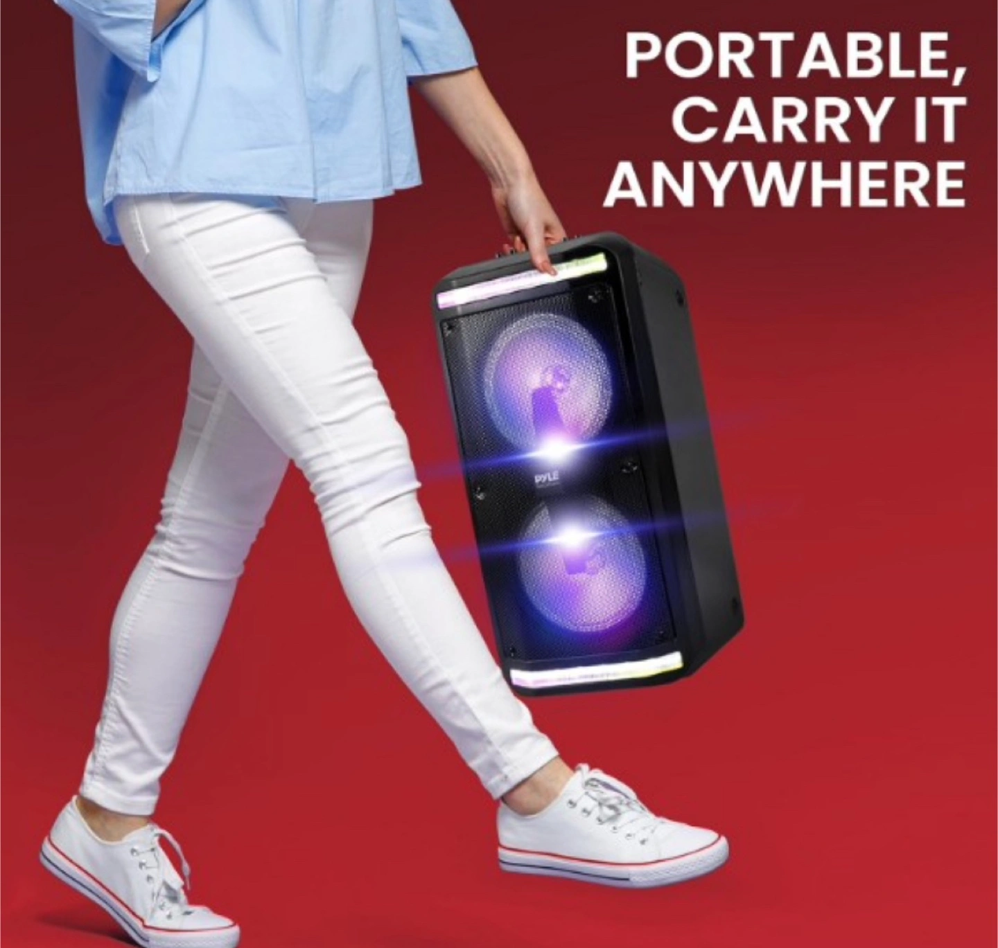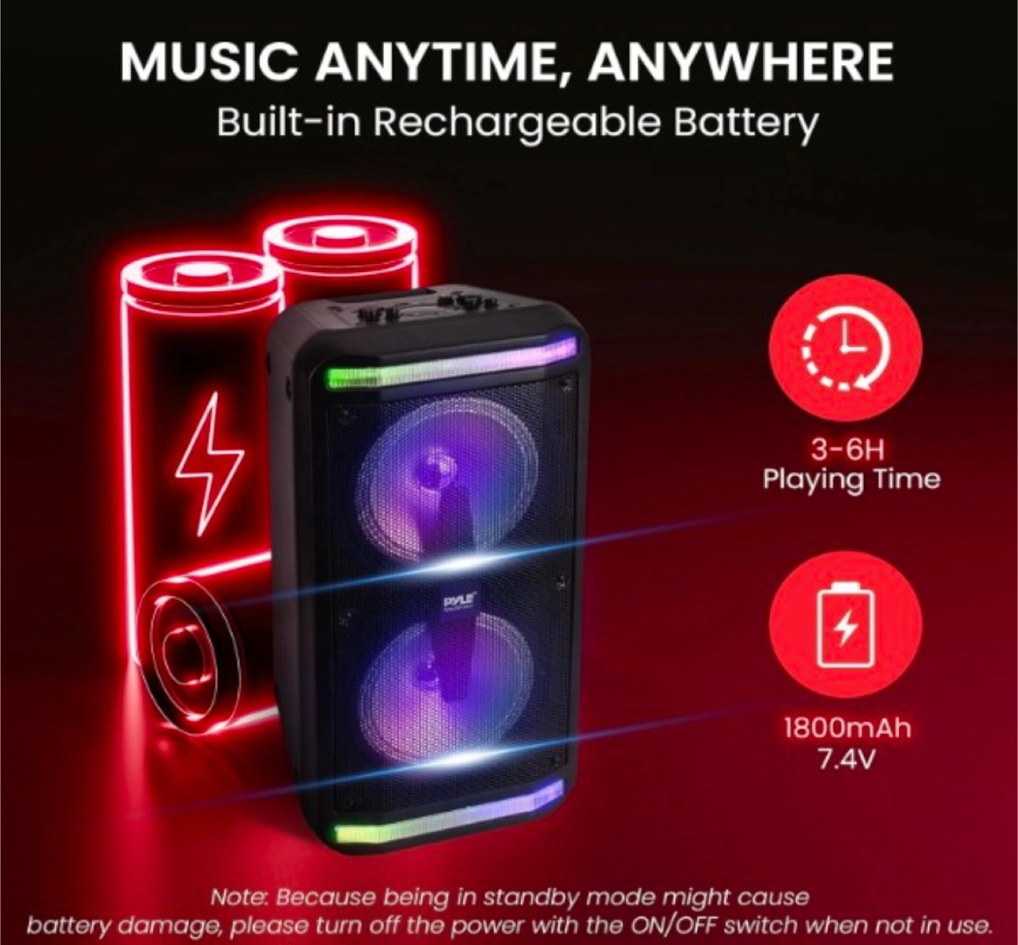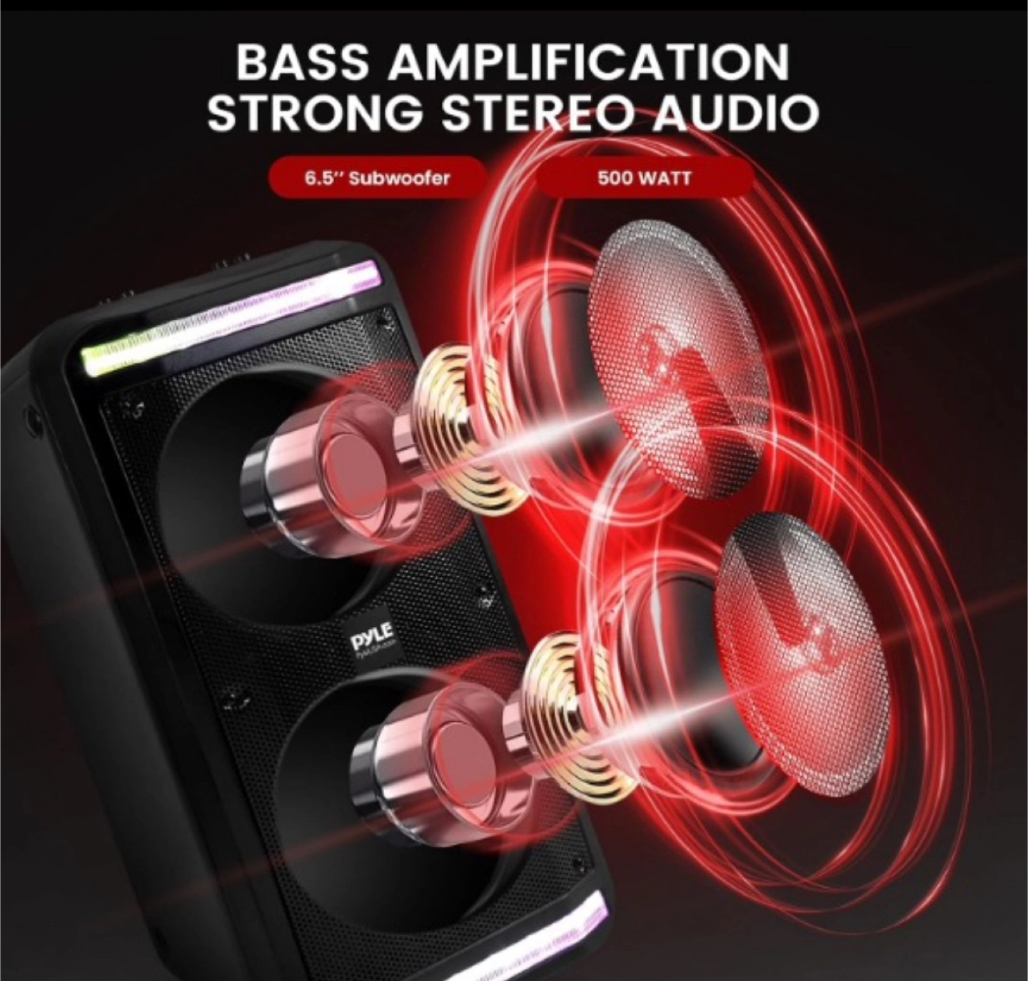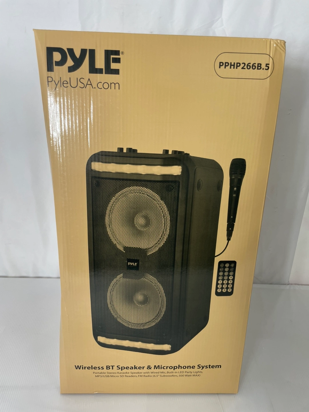 12Brand: Pyle Model: PPHP266B.5 Condition: New Open Box SKU: 0018 Pickup: Electric Deals 474 Queen St. West, Toronto, ON Monday to Friday 11:00 am - 7:00 pm Sat and Sunday 11:00 am - 5:00 pm About this item: 500 WATT POWER: This high powered wireless karaoke PA portable bluetooth speaker is equipped w/ dual 6.5" subwoofers with 500 watt peak power / 250W RMS at 3 ohm for full range surround stereo sound reproduction and impressive bass response COMPATIBLE WITH BLUETOOTH: The box type loud bluetooth speaker system is compatible w/ bluetooth for wireless audio streaming and works w/ devices like iPhone, Android mobile phone, iPad, tablet, PC Ideal for personal indoor home and outdoor use 5 INPUTS: Pyle bluetooth speaker karaoke Pyle PA speaker is equipped w/ USB flash drive port & micro SD card reader so it can serve as an MP3 player, 3.5mm AUX input, ¼" guitar input & ¼" microphone input. Includes wired microphone for home karaoke FLASHING DJ LIGHTS: The party speaker with microphone boombox features multi-color flashing LED lights that adds life to any occasion, great for parties/night gatherings when a colorful presence is noticeable. Also has FM radio w/ digital LCD display AUDIO RECORDER: The bluetooth speakers with lights for party has the ability to record vocals via mic, FM & bluetooth audio w/ easy one-button activation. Also features built-in rechargeable battery, convenient handle & top panel audio control center.