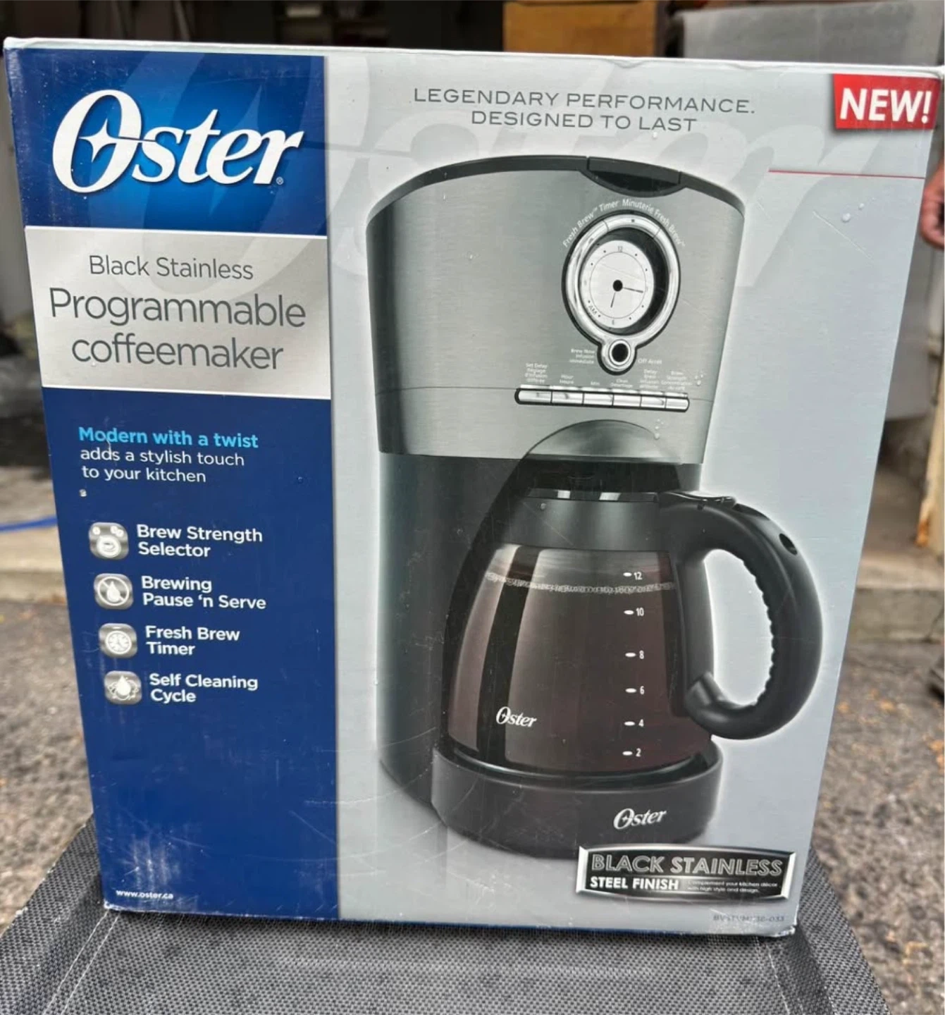 34I'm selling a brand new Oster Black Stainless Programmable Coffeemaker! It's designed with legendary performance and built to last. This coffeemaker adds a stylish touch to your kitchen with its modern twist. It also features: - Brew Strength Selector - Brewing Pause 'n Serve - Fresh Brew Timer - Self Cleaning Cycle