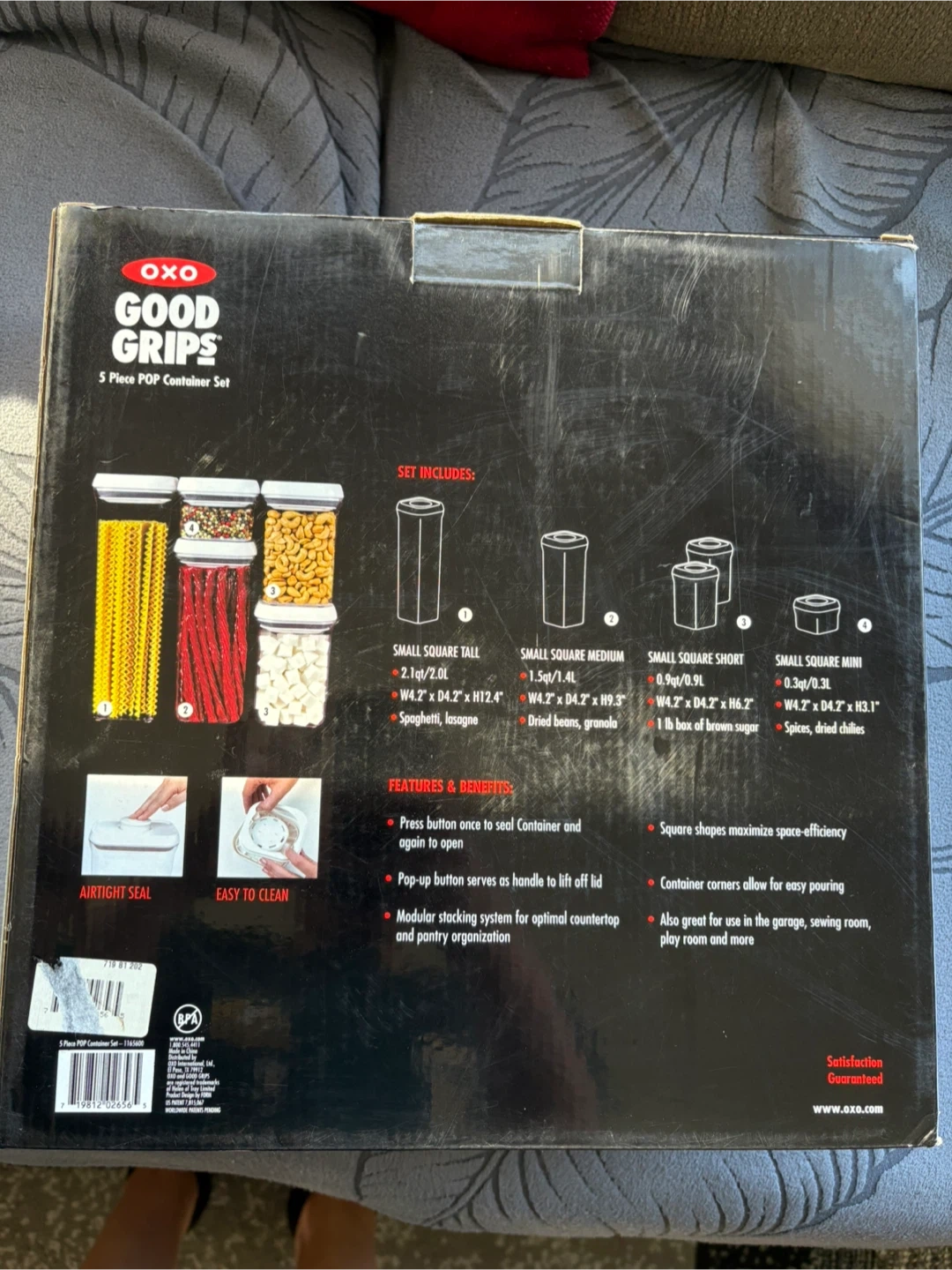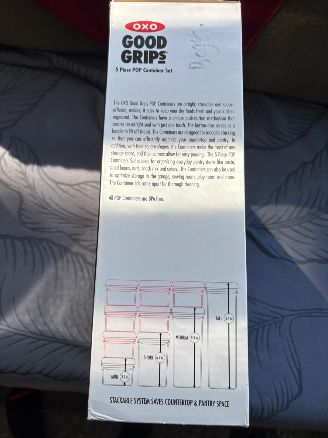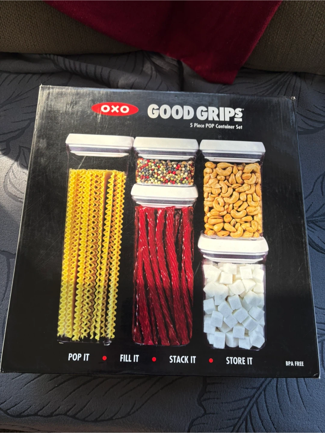 Selling a brand new OXO Good Grips 5-Piece POP Container Set! This set is airtight, stackable, and space-efficient, making it easy to keep your dry foods fresh and your kitchen organized. The containers have a unique push-button mechanism that creates an airtight seal with just one touch. Includes containers in various sizes for spaghetti, lasagna, dried beans, granola, brown sugar, spices, and dried chilies. Box is included!