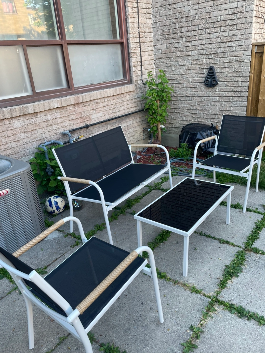 Selling brand new beautiful 5-piece patio set! Perfect for relaxing, entertaining, or summer BBQs. In box. Includes: • 1 loveseat (seats 2) • 2 armchairs • 1 glass-top coffee table Condition: Excellent, never used Weather-resistant mesh (black) Tabletop: Tempered glass Perfect For: Backyard, patio, deck, balcony Selling for $160 Pickup only. Serious inquiries only please!