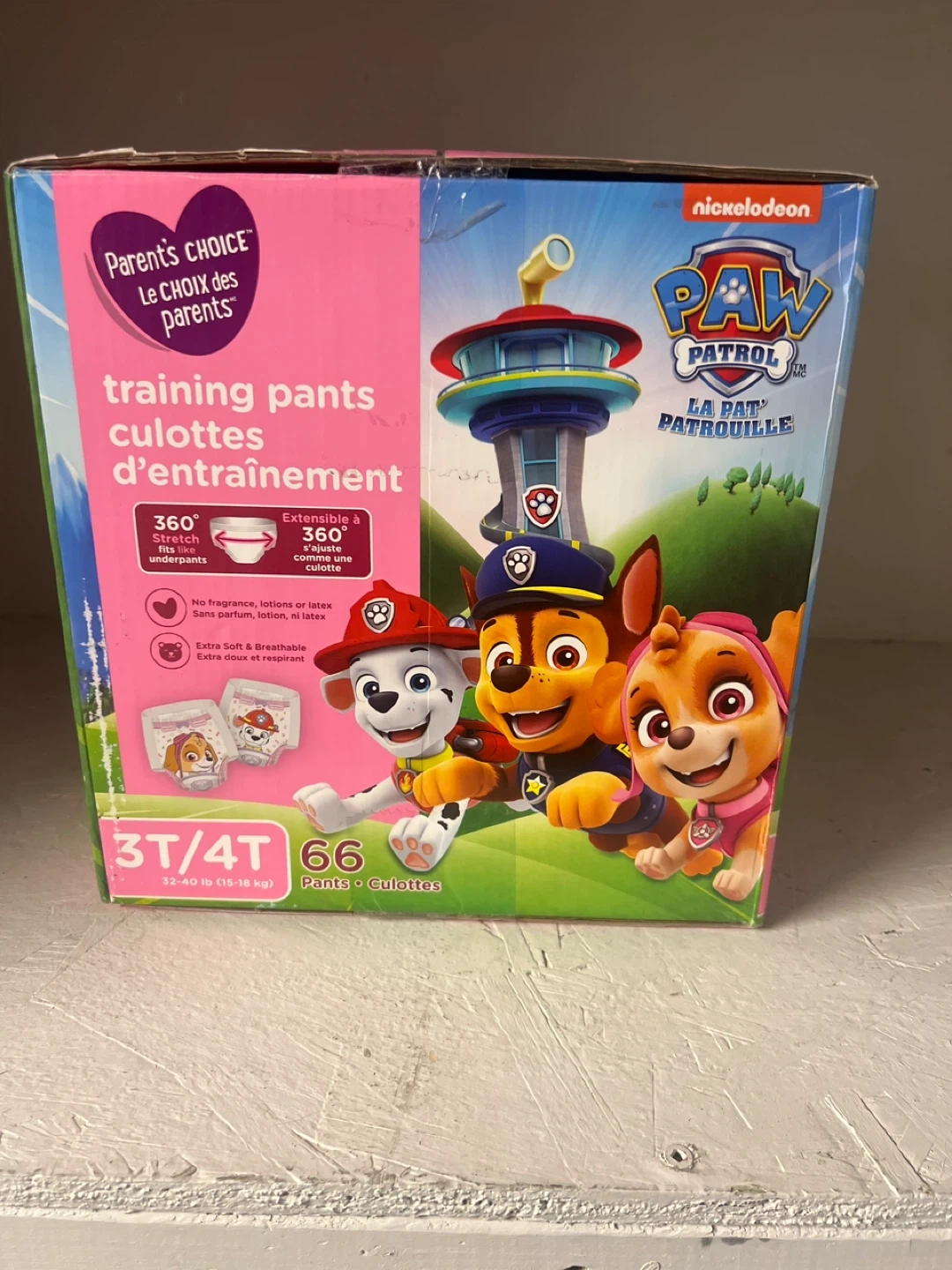 94Selling a brand new box of Paw Patrol training pants! These are size 3T/4T and fit children weighing 32-40 lb (15-18 kg). There are 66 pants in the box. They feature 360° stretch for a comfortable fit, and are extra soft and breathable. Plus, they're made without any fragrances, lotions, or latex