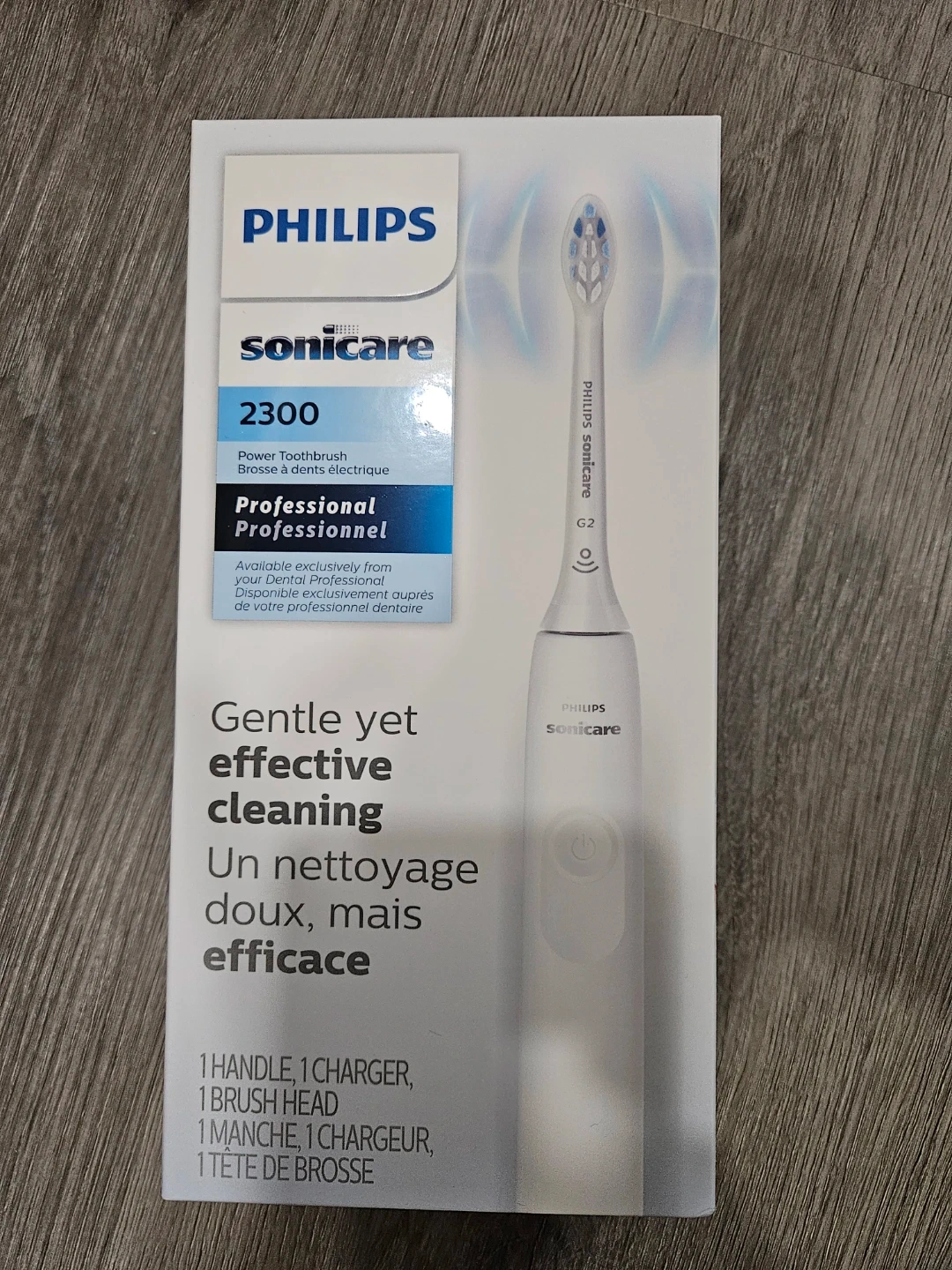 73Selling a brand new Philips Sonicare 2300 power toothbrush! It's still in its original packaging, never been opened. Includes: - 1 handle - 1 charger - 1 brush head Get gentle yet effective cleaning with this professional toothbrush!